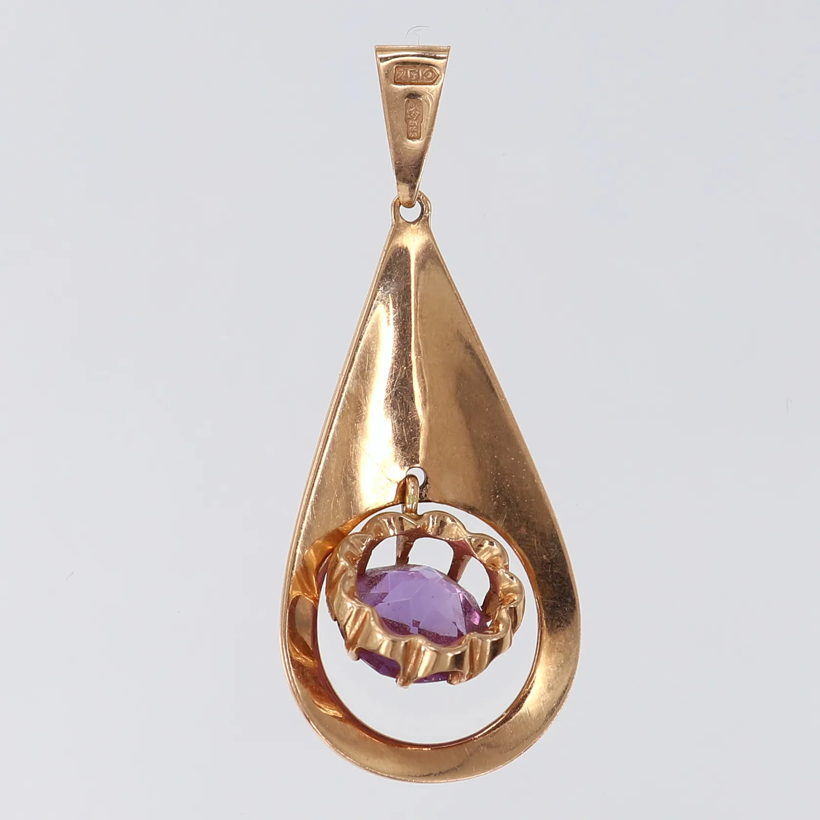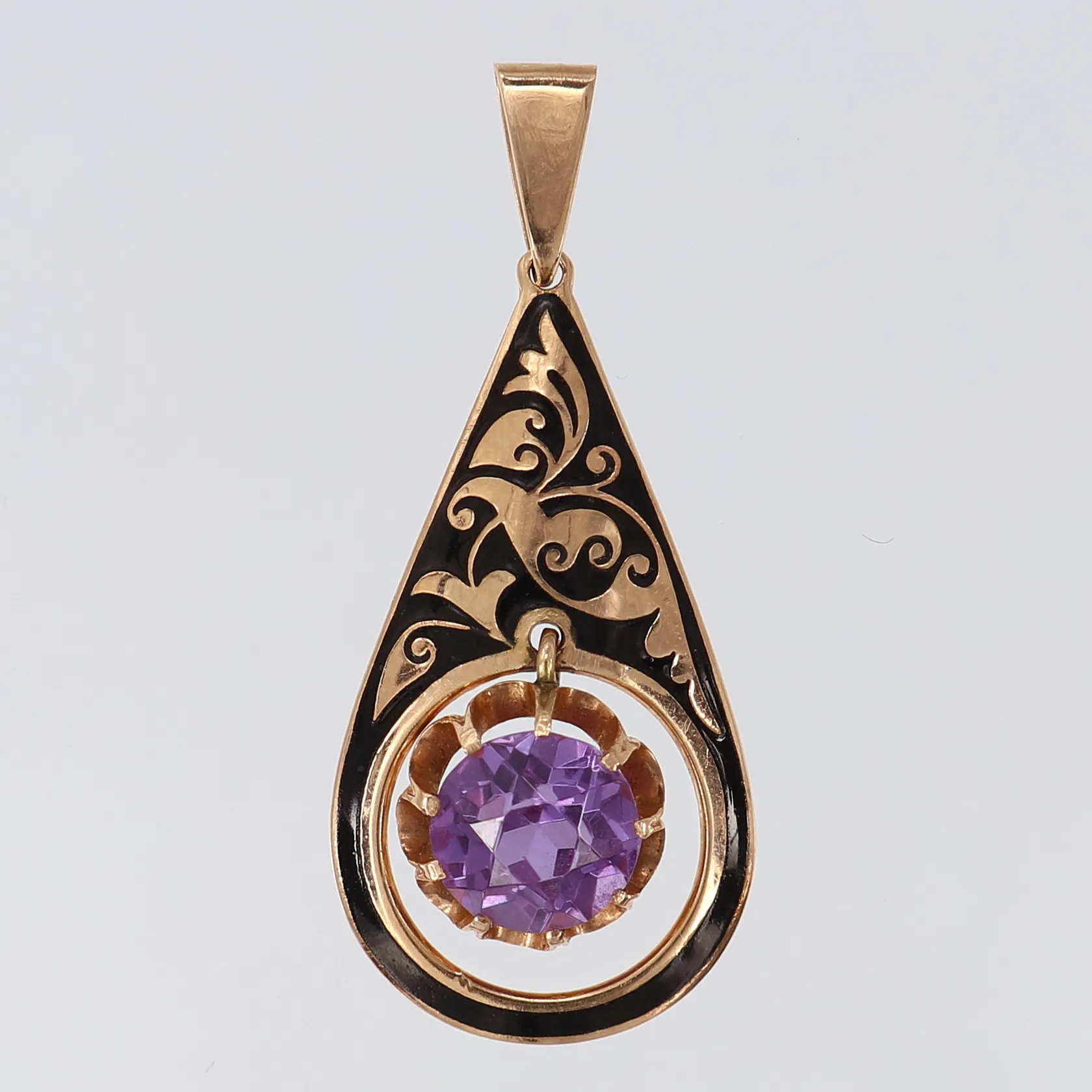 Hänge med dekor emalj samt lila sten, 46x20,5mm inkl ögla, 14K. Vikt: 6,1 g.