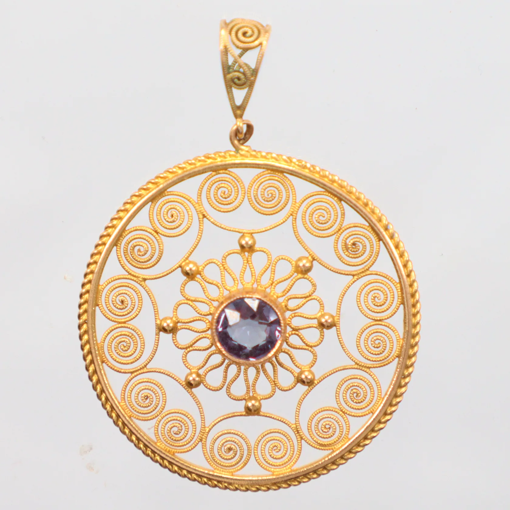 Hänge med lila sten, genombruten dekor ( filigranarbete) längd 4cm, bredd 3cm, 14K. Vikt: 4,3 g.