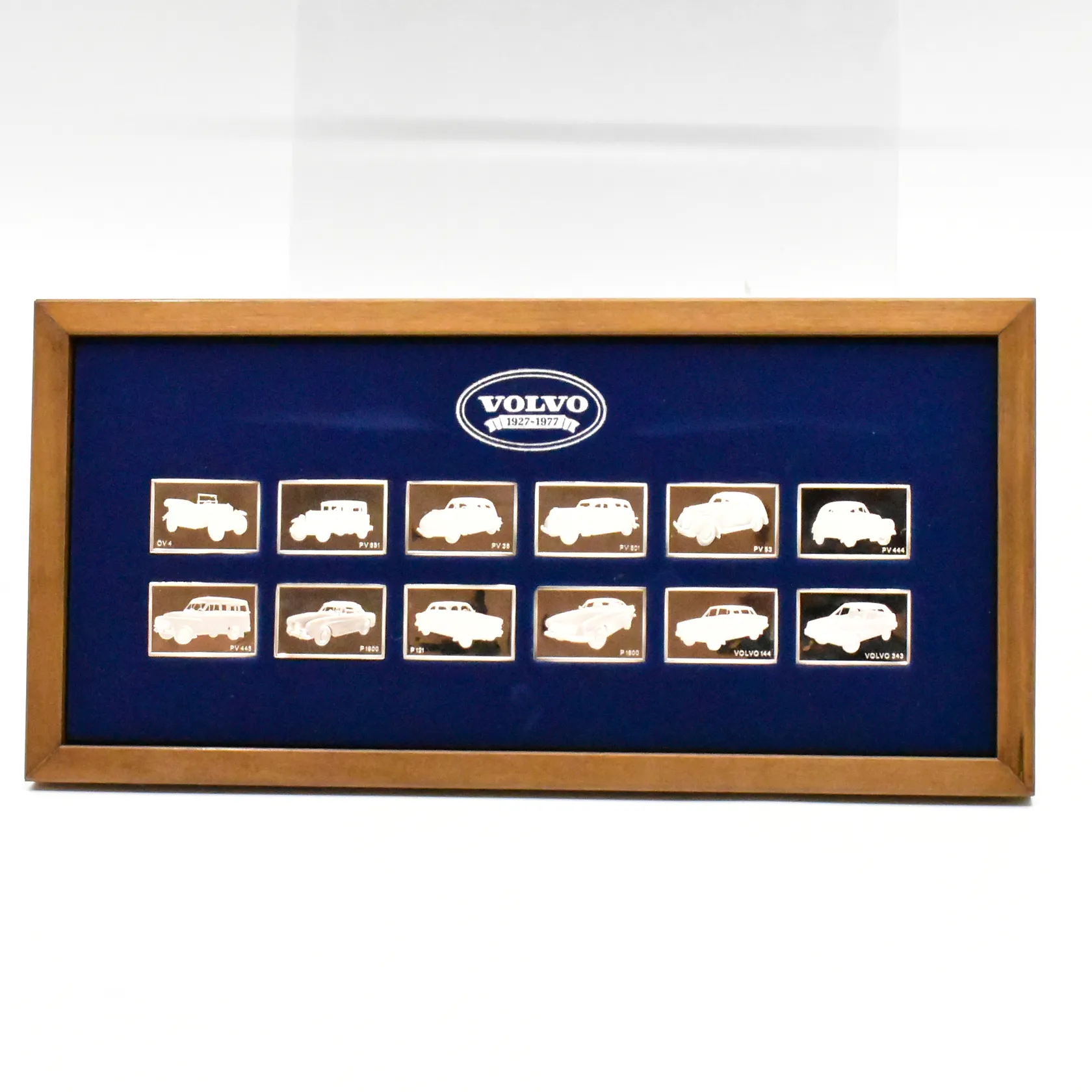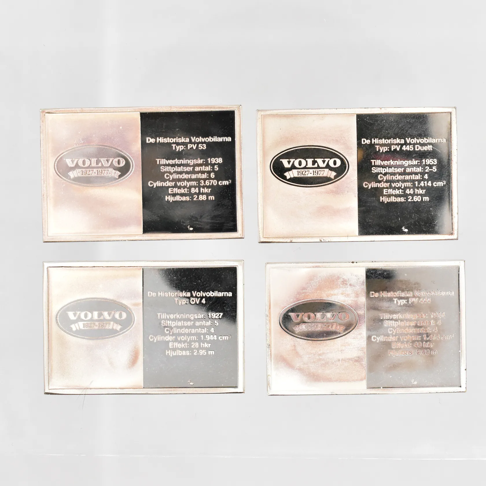 Silverplaketter, De Historiska Volvobilarna 1927-1977, 25x38mm, etui, äkthetsintyg, tillhörande bok, silver 925/1000, vikt 227g ANTIKMÄSSAN 2026 Vikt: 227 g.