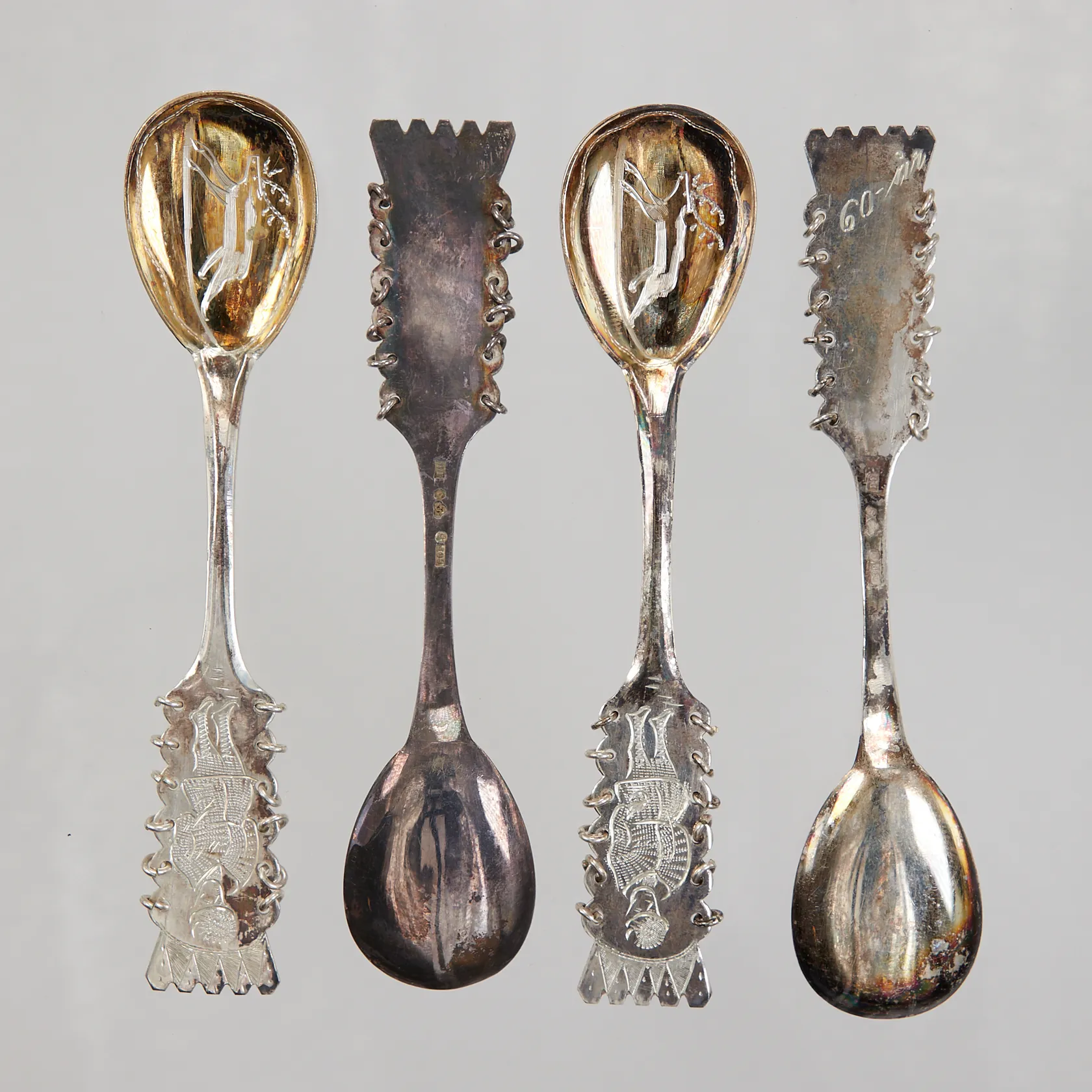 4 Kaffeskedar ca 11,3cm, modell Same, gravyr, COP, Silver 830/1000, Vikt: 52,2 g.