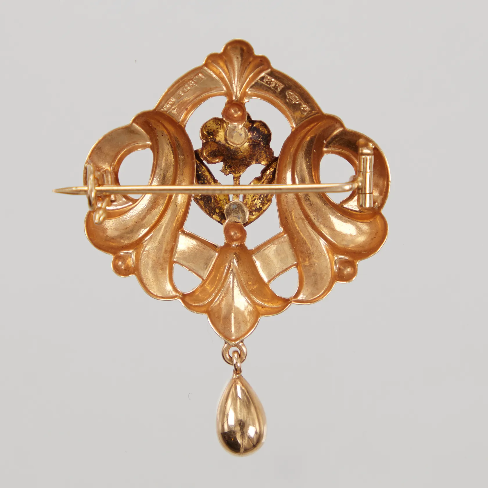 Brosch mönsterdekor samt pärla, 40x30mm, 18K Vikt: 3,5 g.