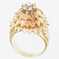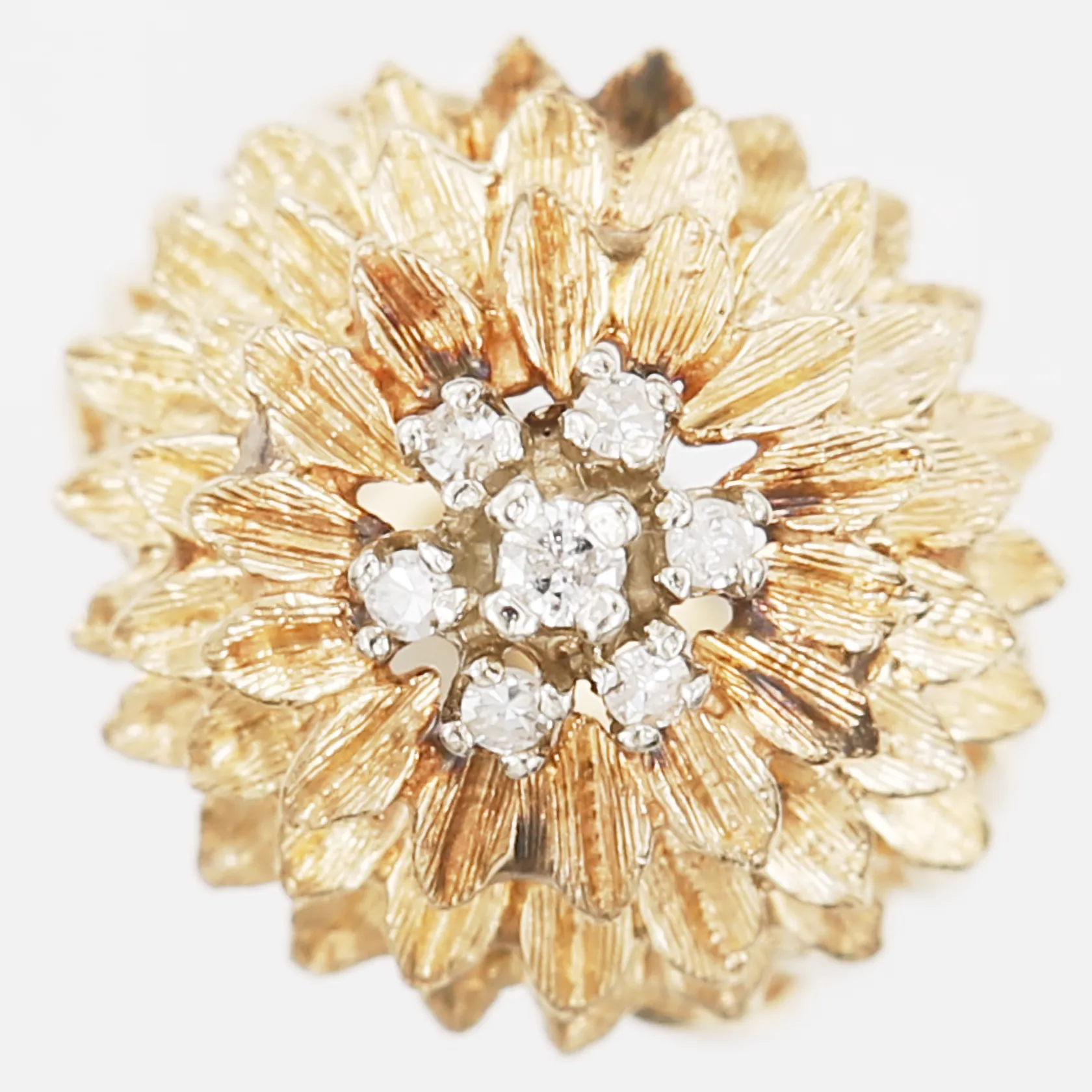 Ring med diamanter 1 x ca 0,04ct samt 6 x ca 0,01ct, stl: 15½, bredd: 3 -18 mm, saknar stämplar, 14K guld. Vikt: 7,7 g.