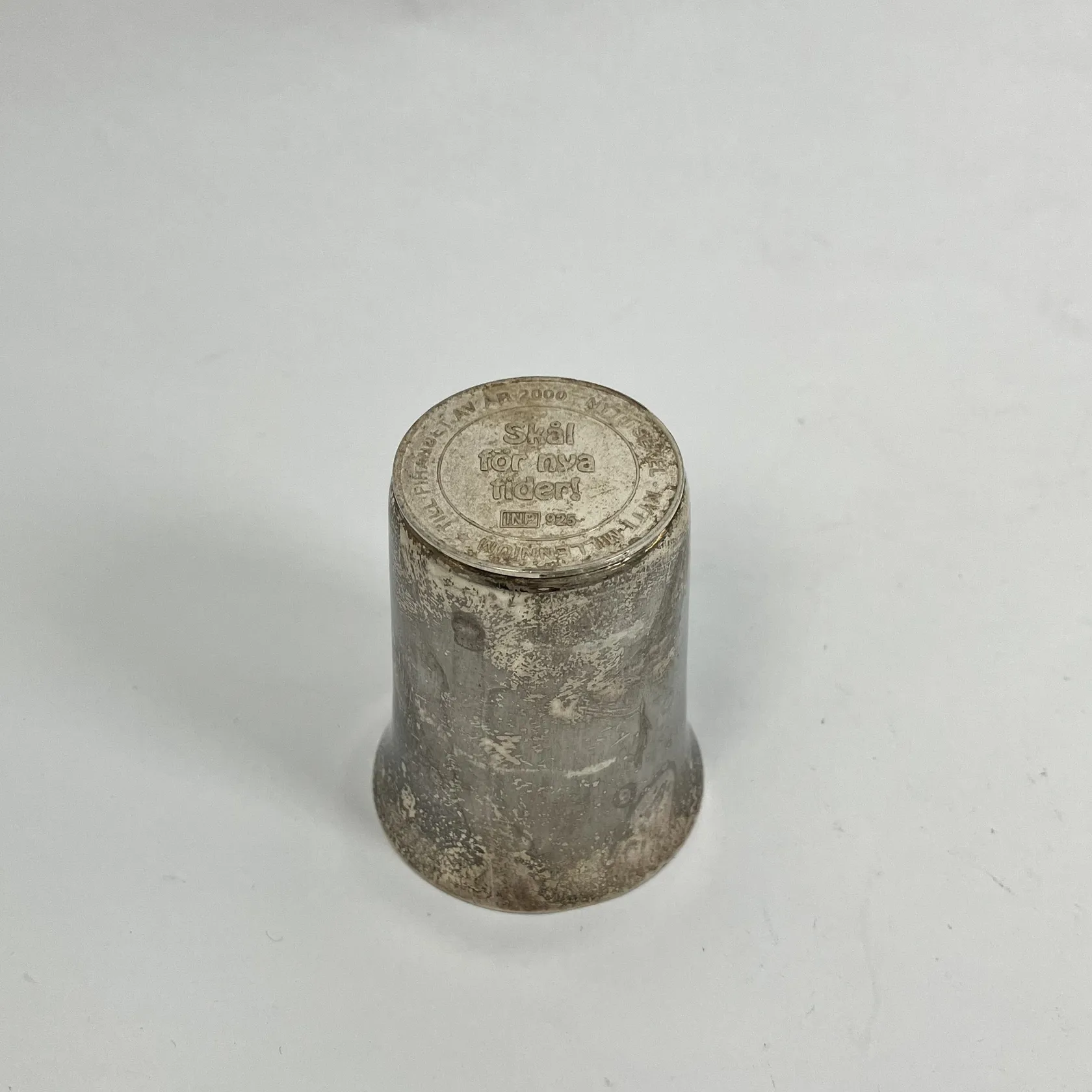 Supkopp Ø5,5cm, höjd 4,3cm, "Skål för nya tider - Nytt millenium - Till firandet av år 2000 - Nytt sekel", ojämnheter, INP, 925/1000 silver Vikt: 28,9 g.