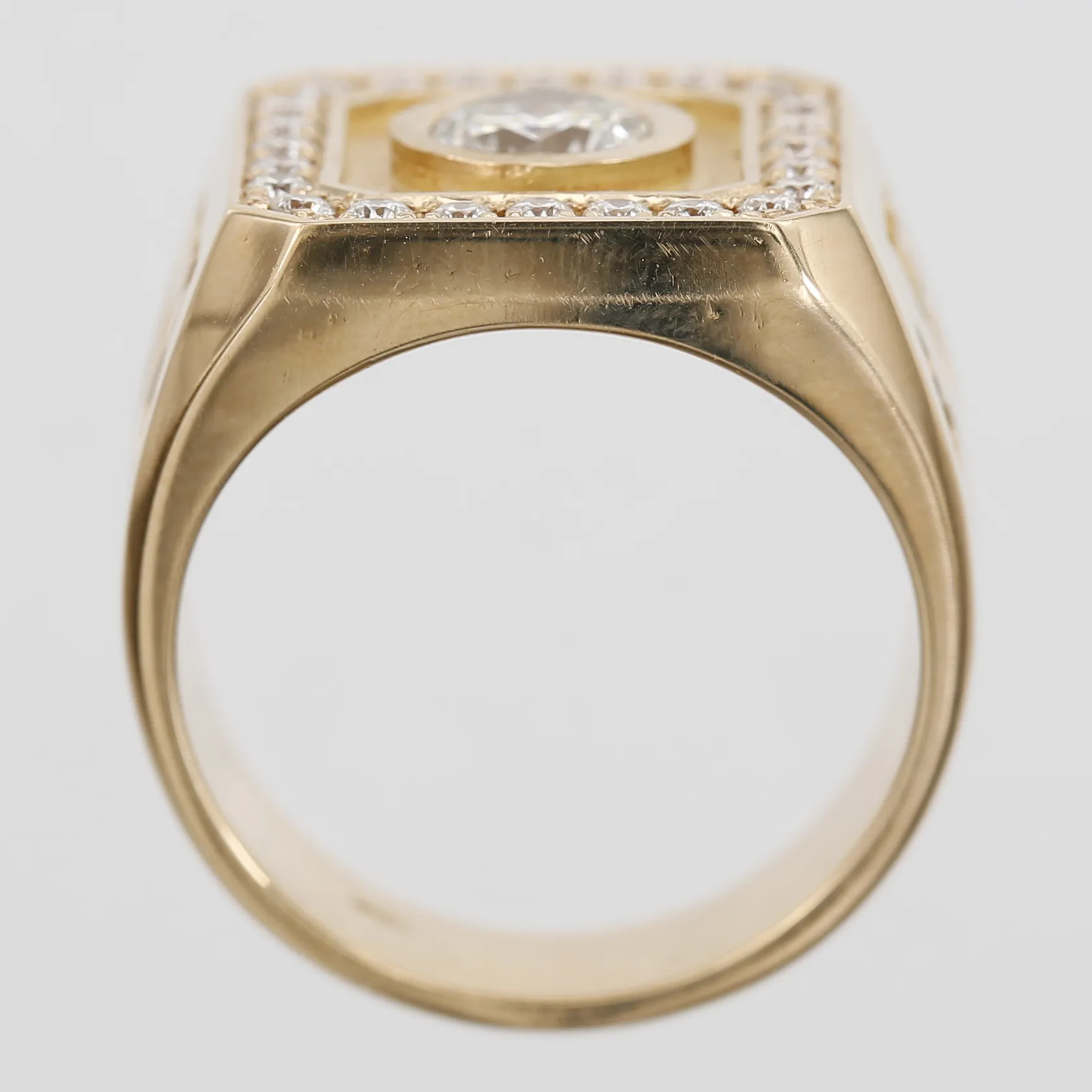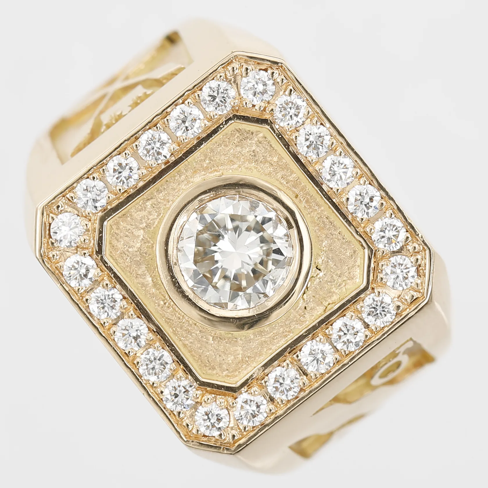Klackring med diamanter, mittsten ca 1,00ct, kvalitet ca Cr-TCa(J-K)/SI, sidostenar 24x0,02ct, stl:19, bredd 6-16 mm, 18K guld. finns för visning på kontoret Östermalm Vikt: 26 g.
