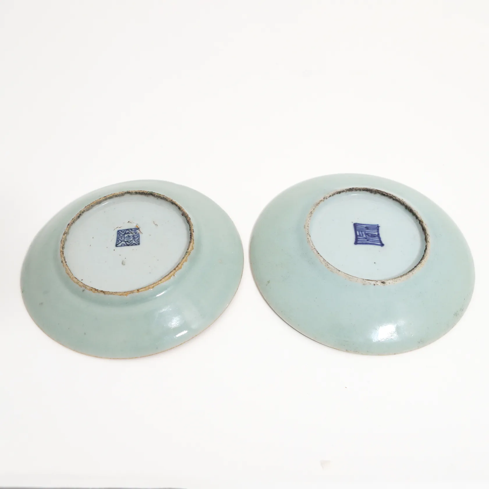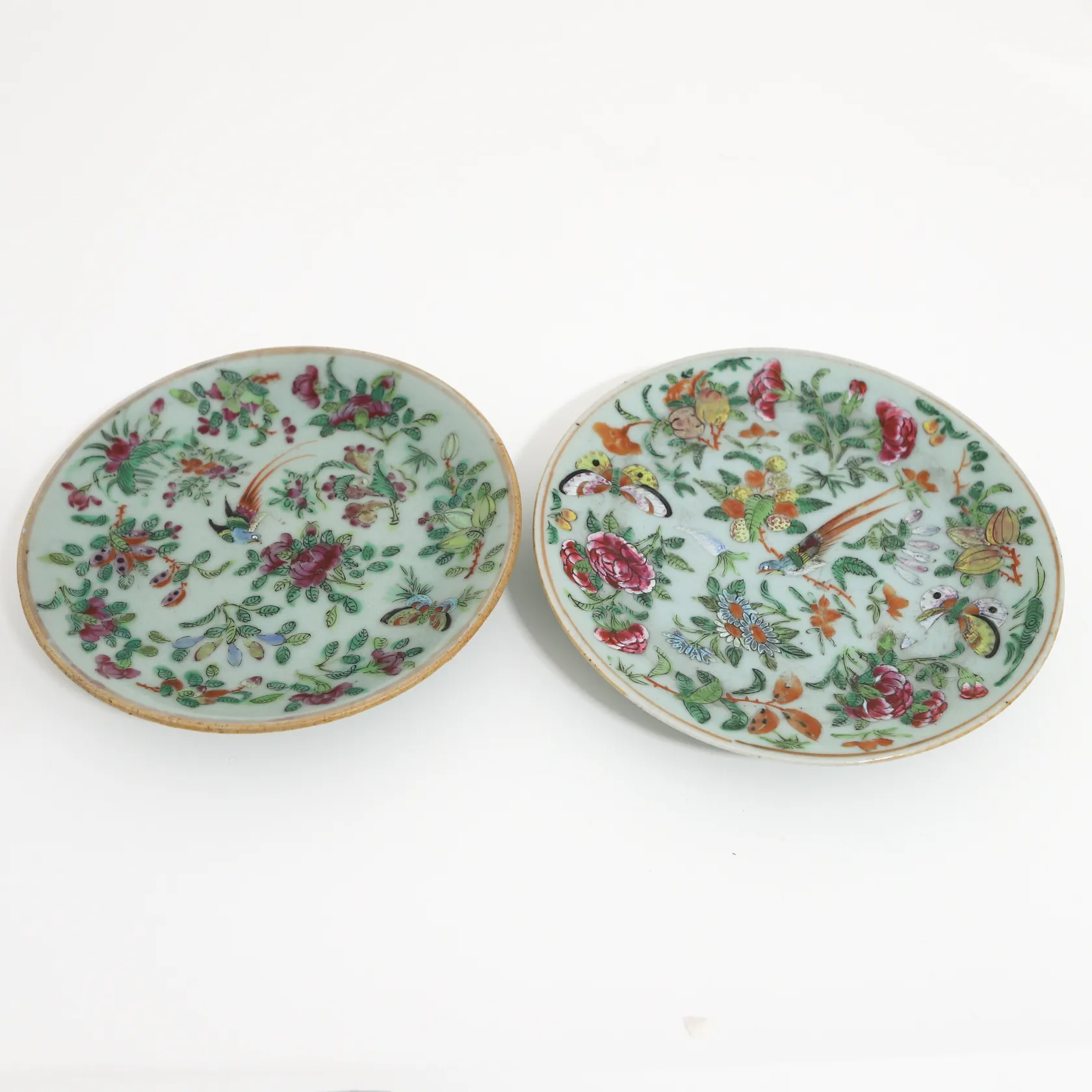 Två fat porslin Famille rose Kina 1800-talets slut, grön underglasyr dekorerat med fåglar samt växtlighet, Ø18cm, mindre kantnagg samt dekorslitage