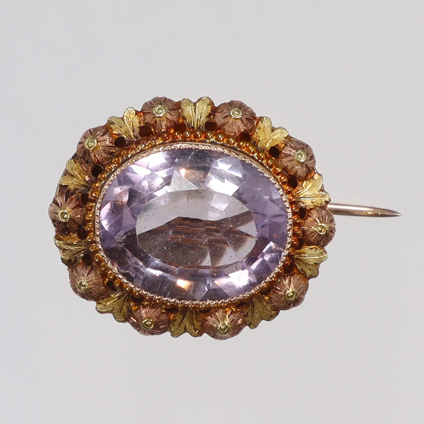 Brosch med trefärgat guld samt ametist ca 4,65ct, omarbetad/tennlödninhgar, troligen år 1820, svenska stämplar, mått 20 x 15mm, 18K guld Vikt: 4,3 g.