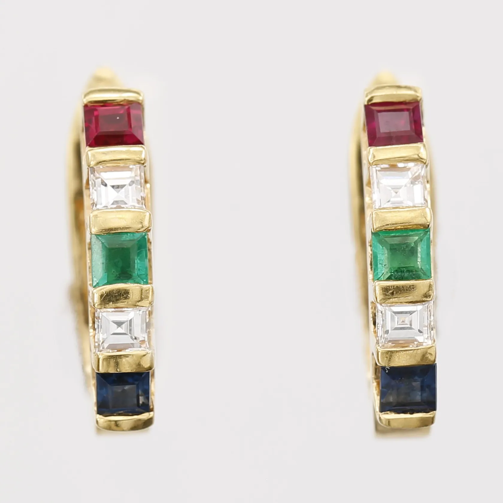 Ett par örhängen med prinsesslipade diamanter 4 x ca. 0,05ct, rubiner, smaragder och safirer, höjd: 15mm, bredd: 3mm, 18K guld Vikt: 4,4 g.