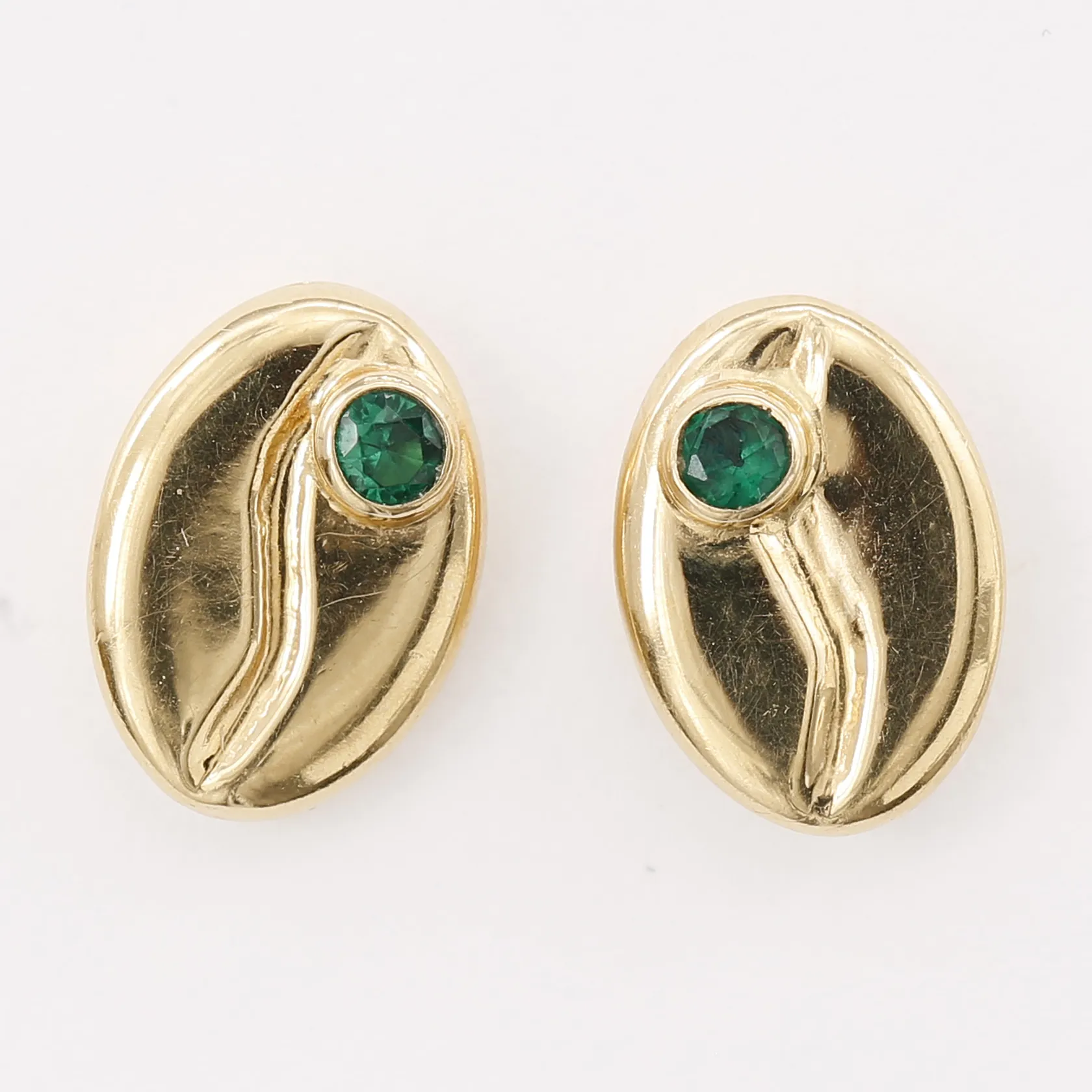 Ett par örhängen med gröna stenar, höjd: 7,5mm, bredd: 10,5mm, silicon snurrebussar, 18K guld Vikt: 0,8 g. Skickas med postpaket.