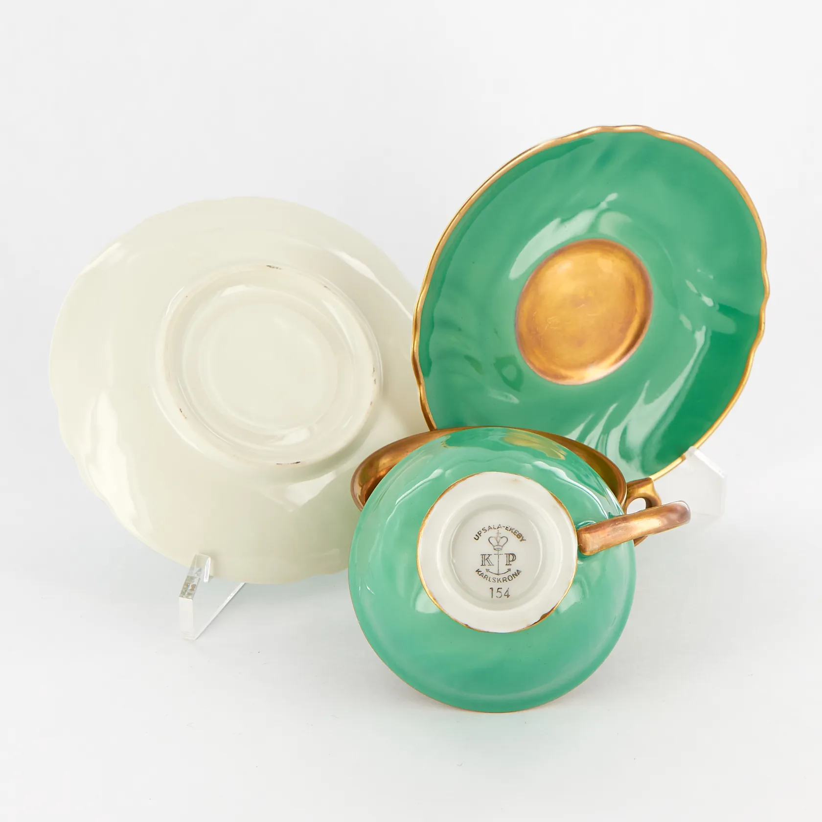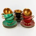 11 koppar Ø80mm, Höjd: 40mm, med 12 fat Ø125mm, K.P, Karlskrona, Upsala Ekeby, emalj i olika färger samt guldfärgad insida,