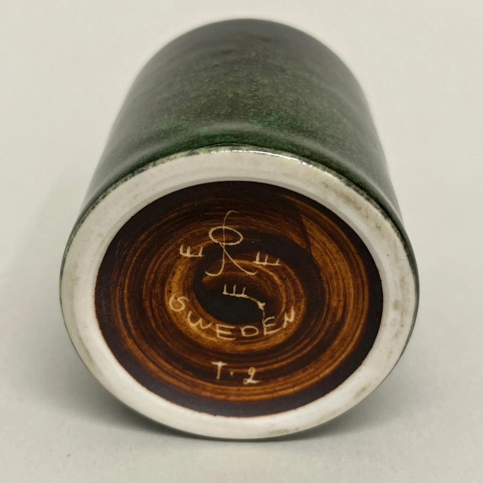 Bordständare, Rörstrand, märkt T2, troligen Carl-Harry Stålhane, grönglaserat stengods, höjd 8cm, ej funktionstestad.
