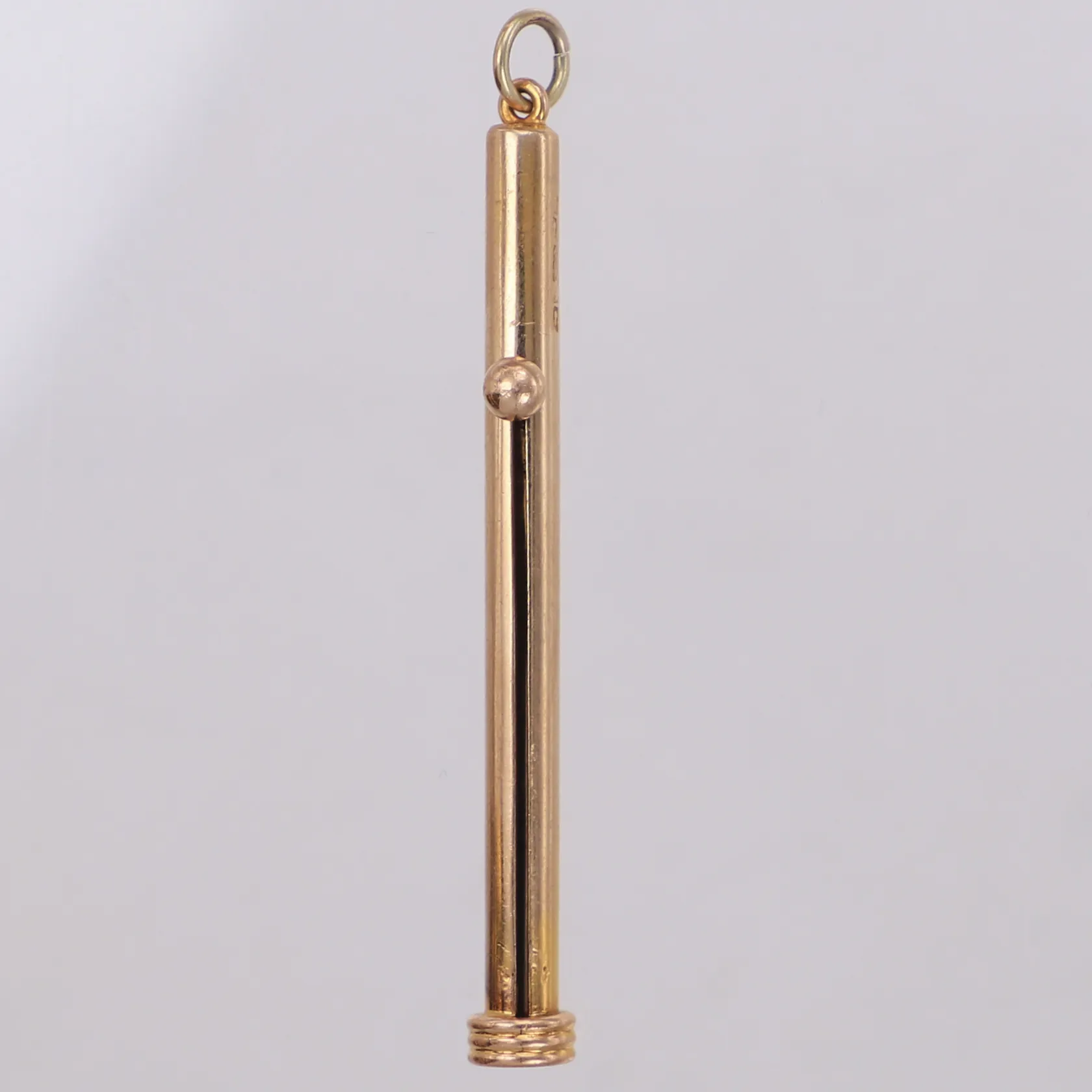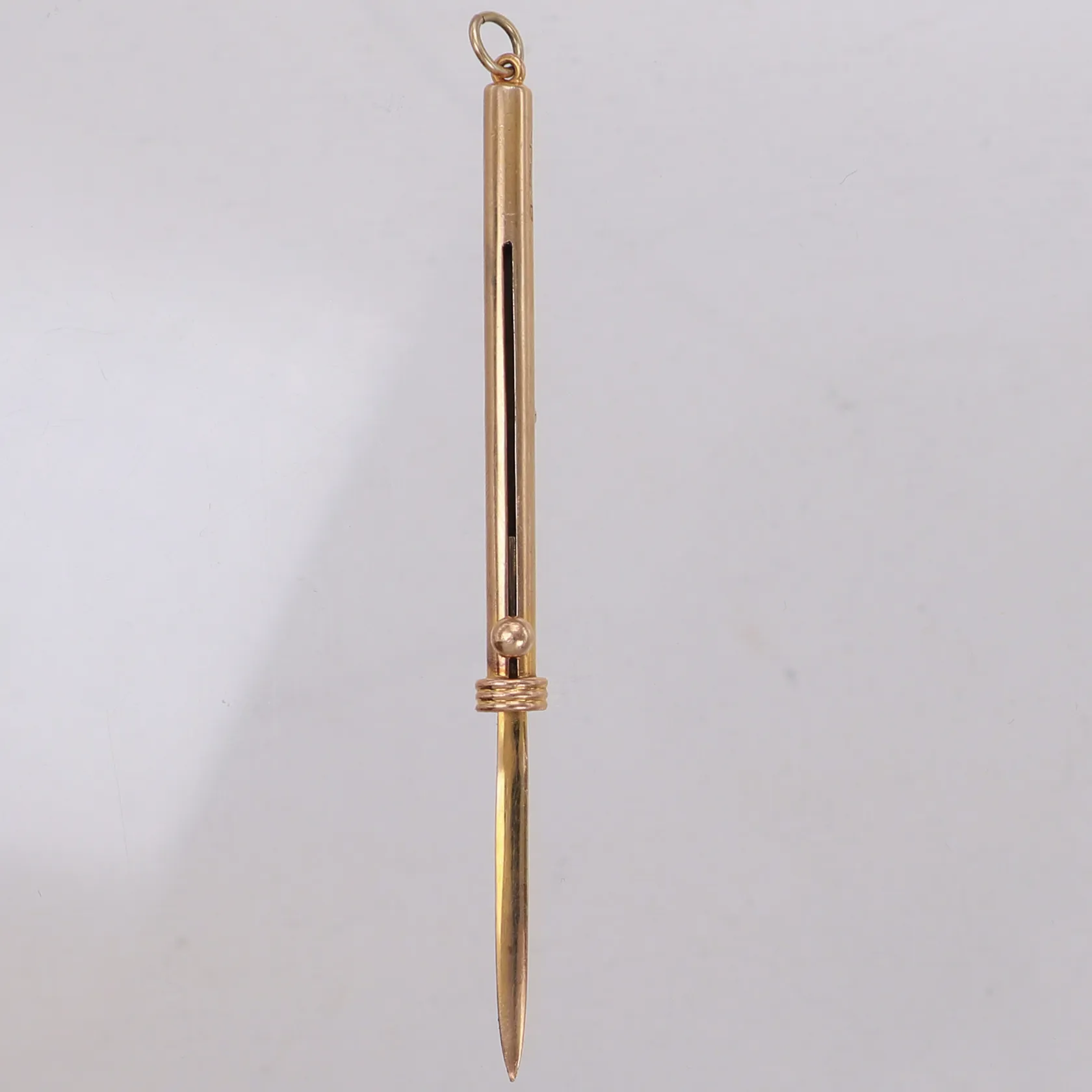 Tandpetare i form av hänge, engelska stämplar, längd 10cm, infällt läge längd 6,5cm, liten buckla, 9K guld. Vikt: 6,2 g.