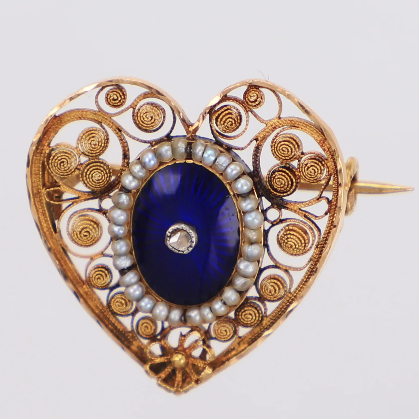 Brosch filigranhjärta med fröpärlor och rosensten, blå emalj, G. Dahlgren & Co, Malmö, tidigt 1900-tal, längd 25mm, bredd 24mm, 18K. Vikt: 4,2 g.