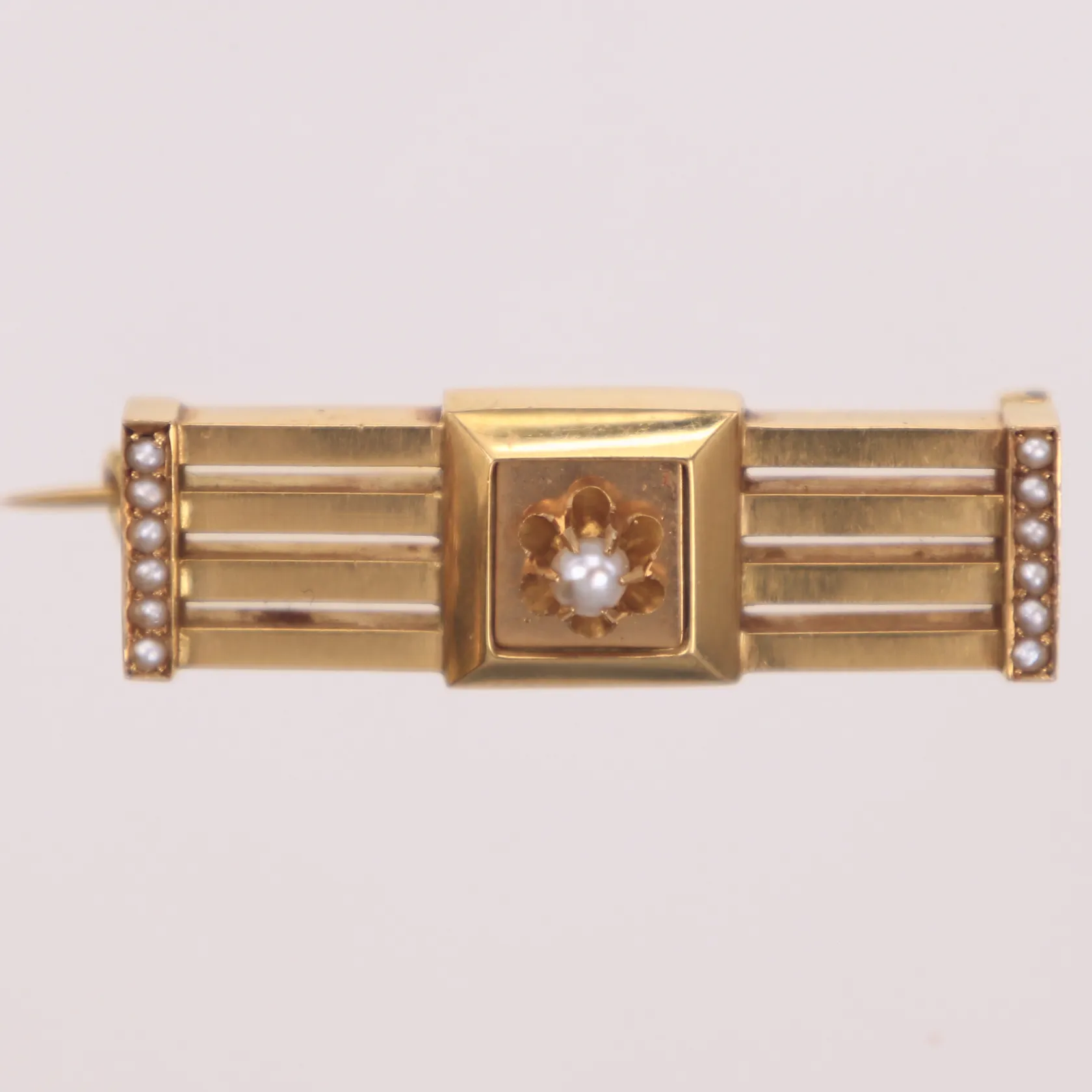 Brosch med fröpärlor, tillverkad av K.Andersson, Stockholm år 1896, längd 12mm, bredd 37mm, 18K guld. Vikt: 6,2 g.
