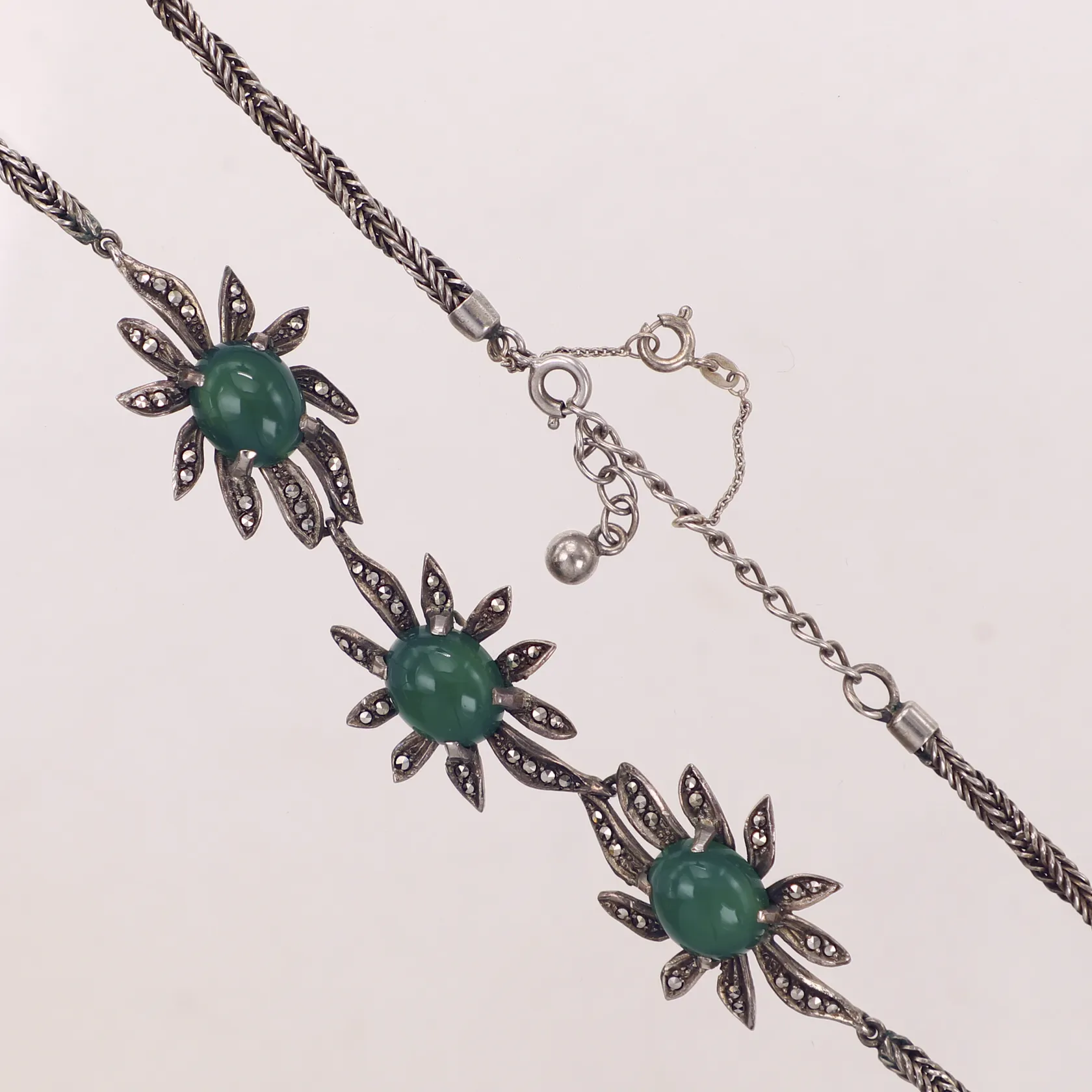 Collier med färgade kalcedoner och markasiter, längd 36-40cm, bredd 20mm, svensk importstämpel, säkerhetskedja, silver 835/1000. Vikt: 23,4 g.