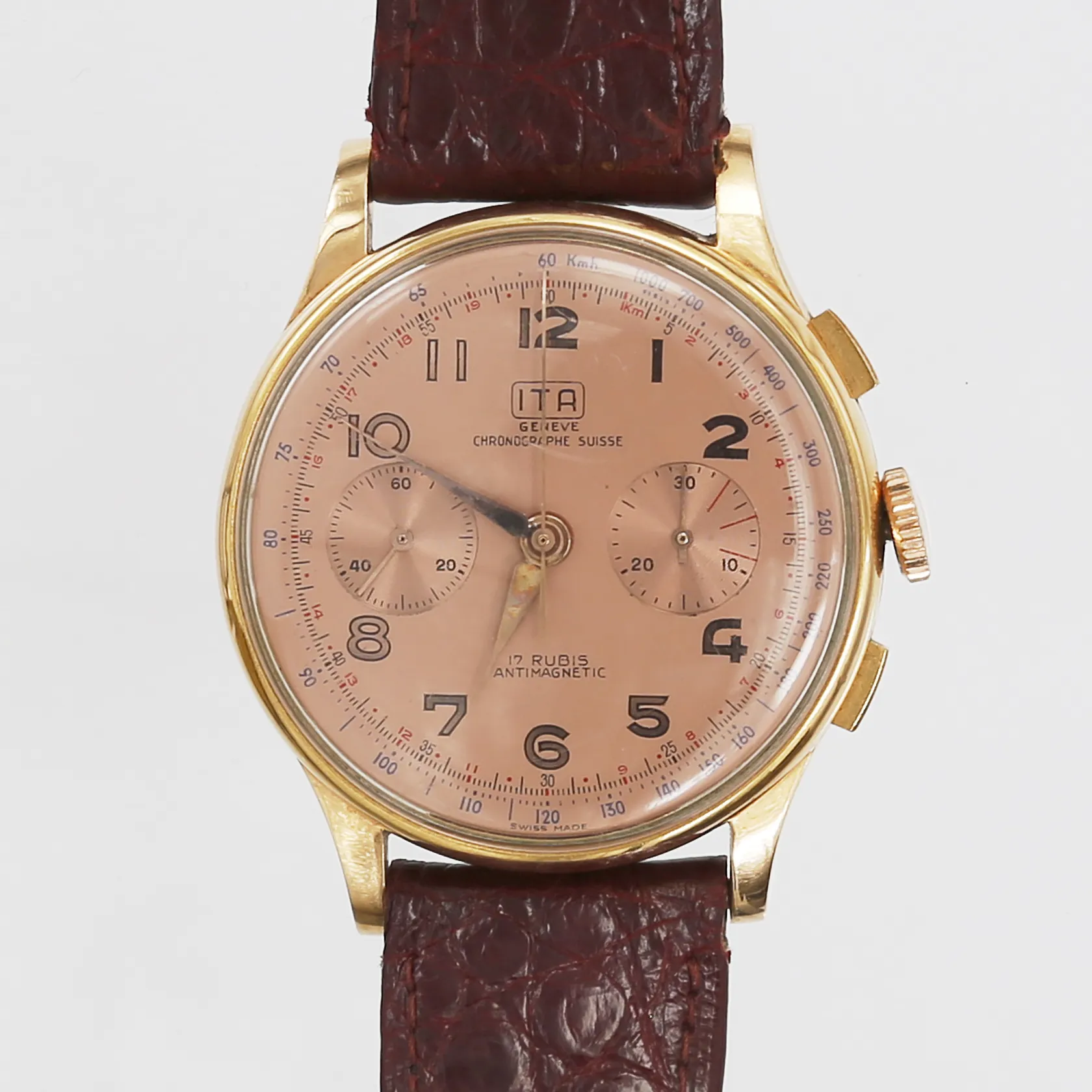 Herrur, Ita Geneve Chronograph, 17 Rubis Antimagnetic, manuell, Ø 36mm, boett i 18K guld, slitage, krona defekt/skev, i behov av service, läderarmband med slitage