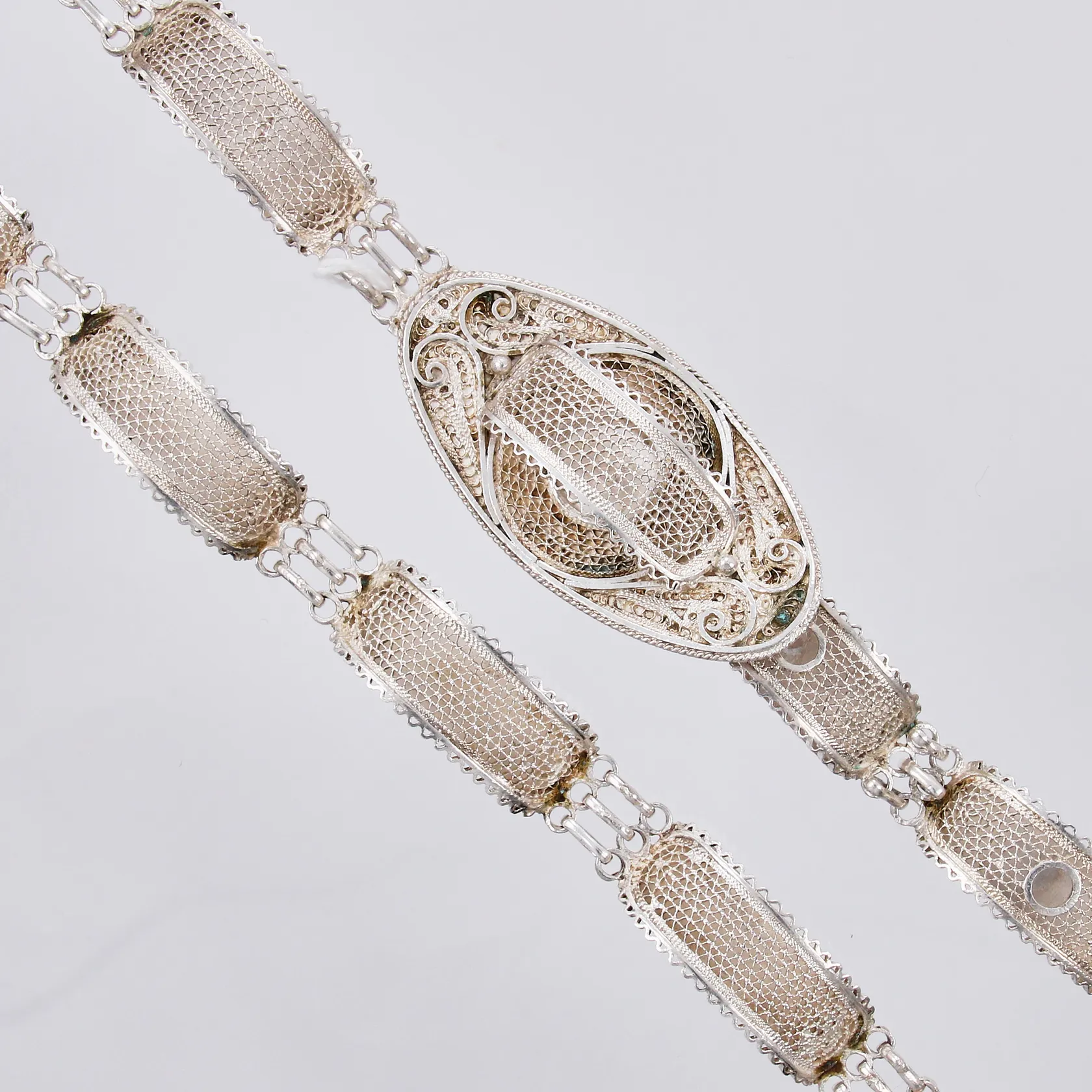 Bälte total längd ca 87cm, uttag för hål vid 72-85cm, bredd ca 30mm, stämplat 950/1000 silver Vikt: 125,2 g.