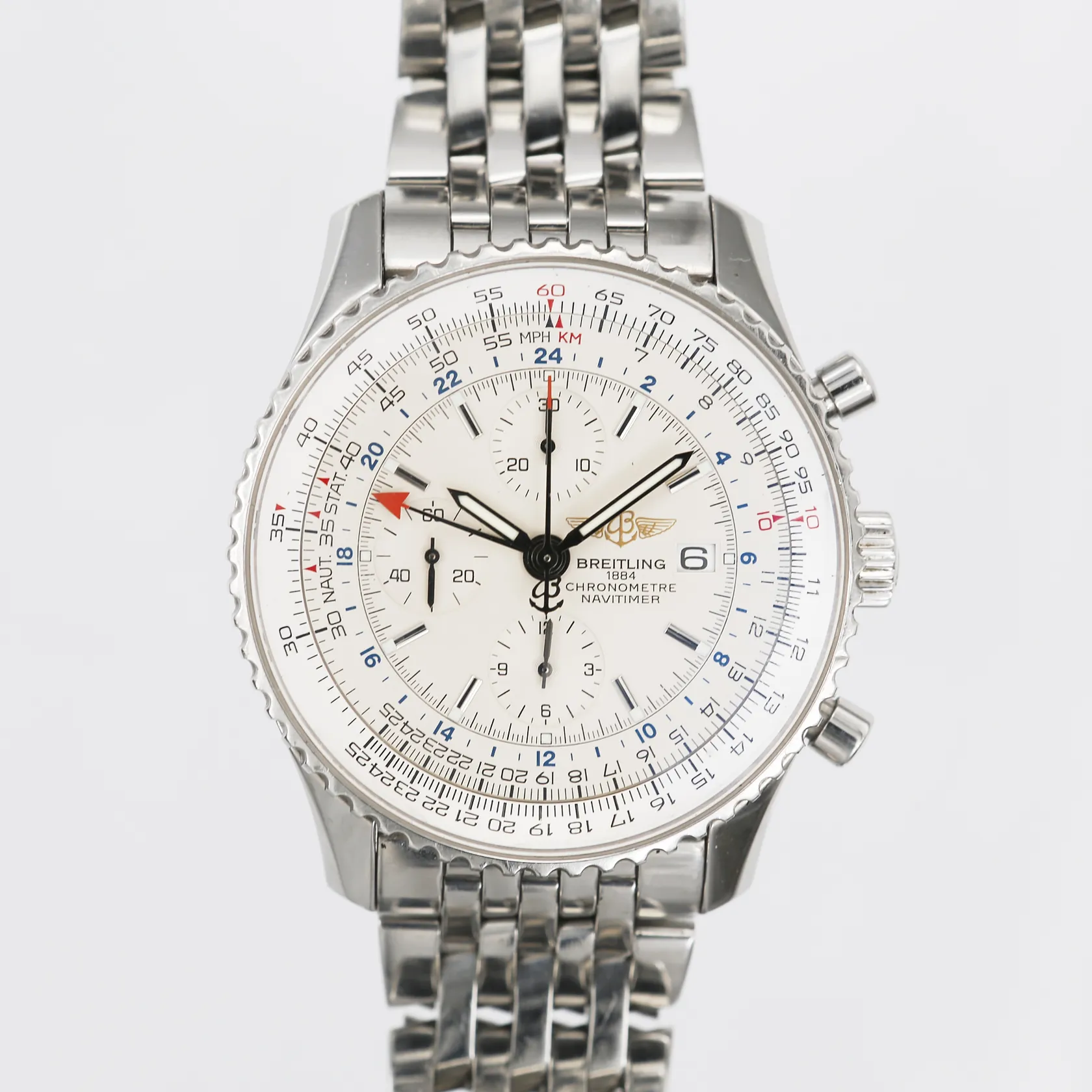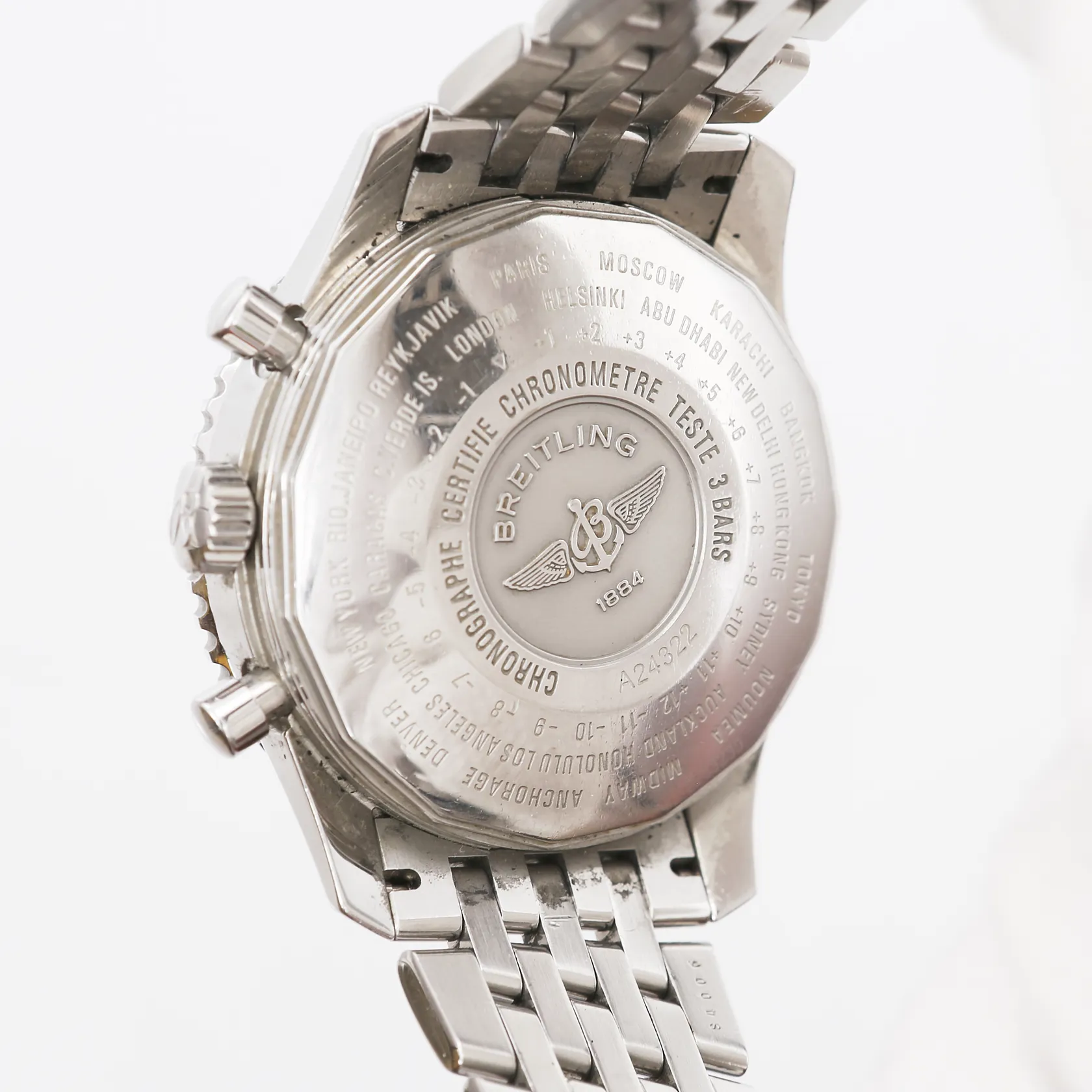 Herrur Breitling Navitimer World GMT, stål, automatisk, Ø46mm, referensnummer A24322, serienummer 2233230, med pilotlänk, slitage, mindre repor, inga tillbehör.