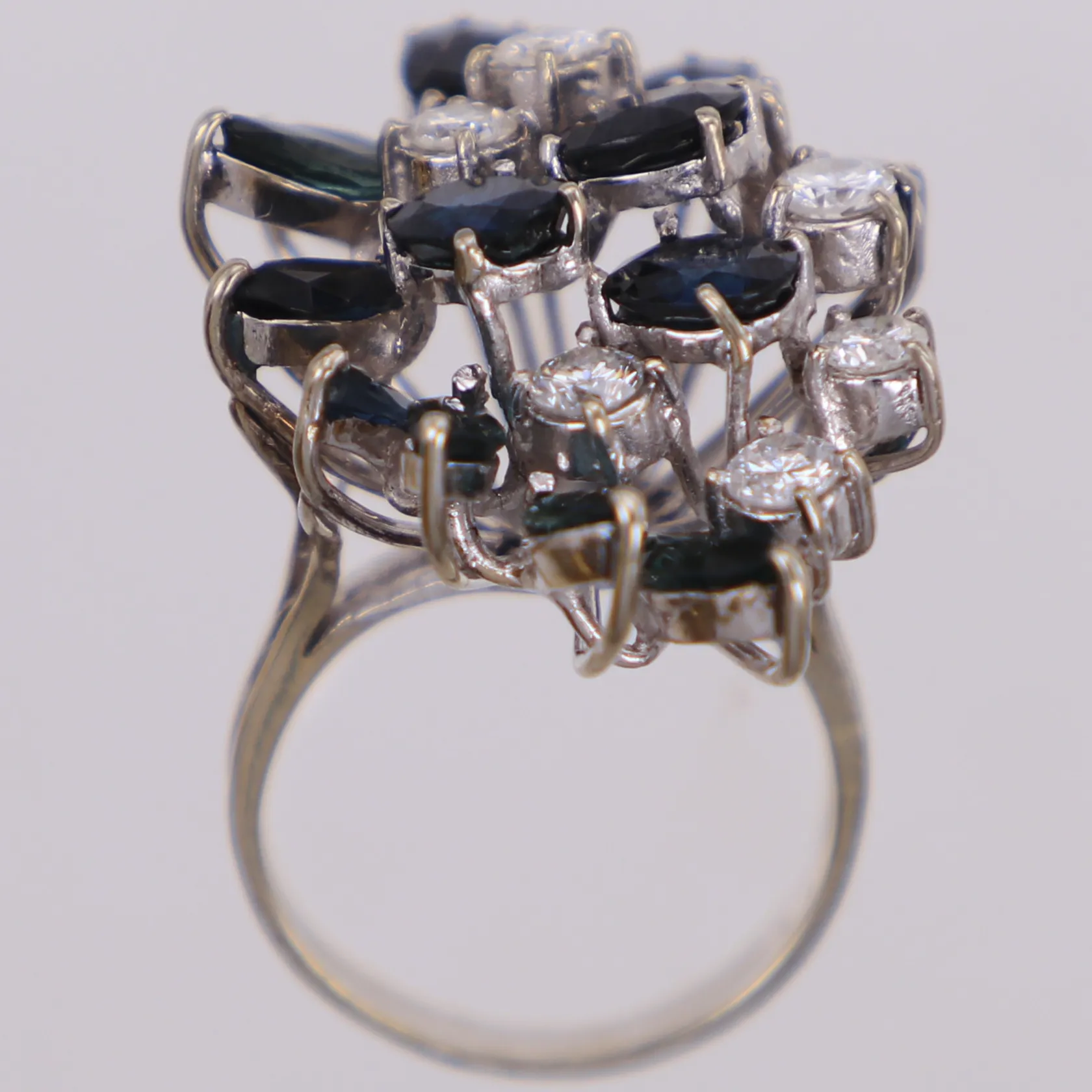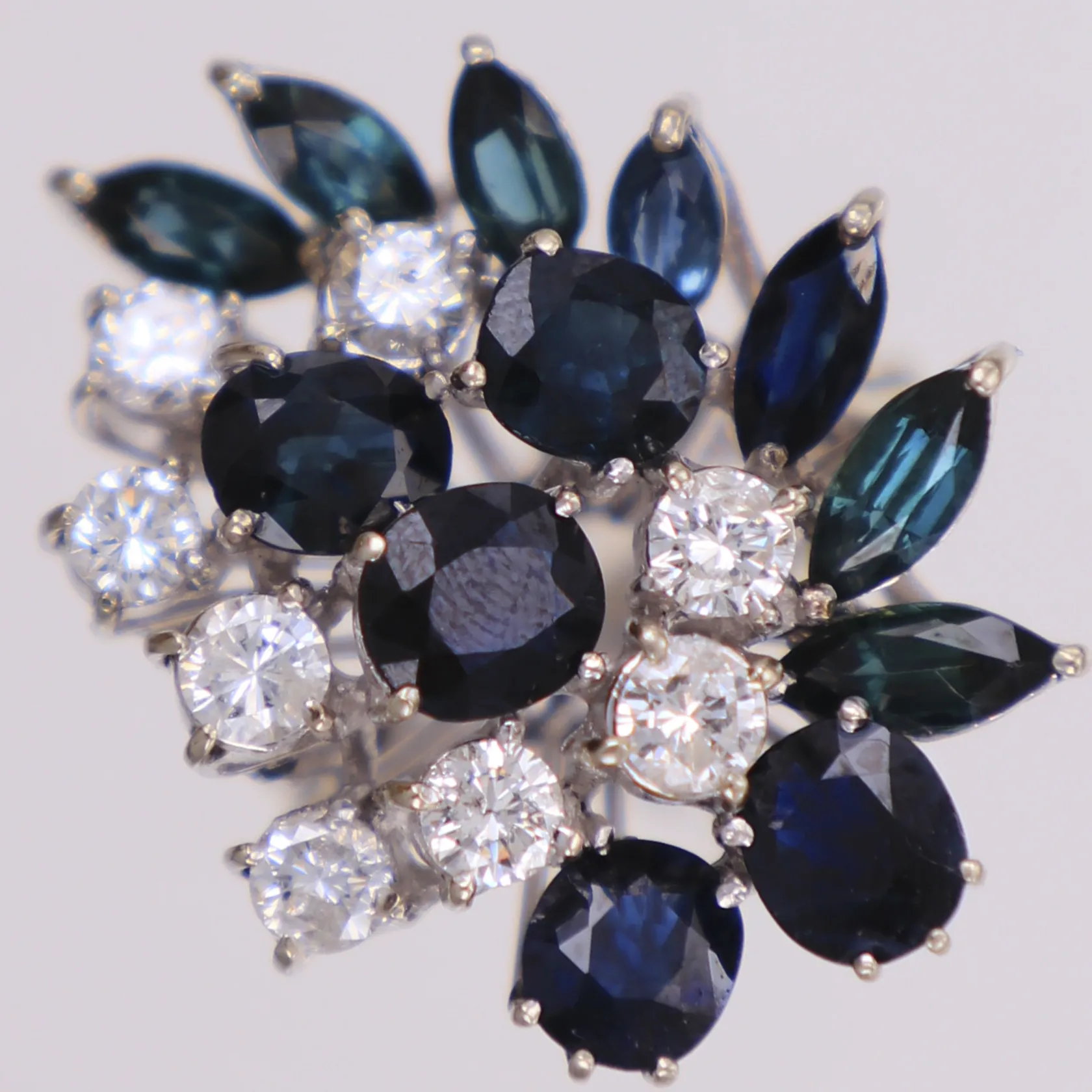 Ring med åtta diamanter ca 1,60ctv, ca TW-W(F-H)/P, blå olikslipade safirer, stl:17½, bredd 2,8-32mm, höjd 16,2mm, nagg på vissa stenar, 18K vitguld. Vikt: 12,4 g.