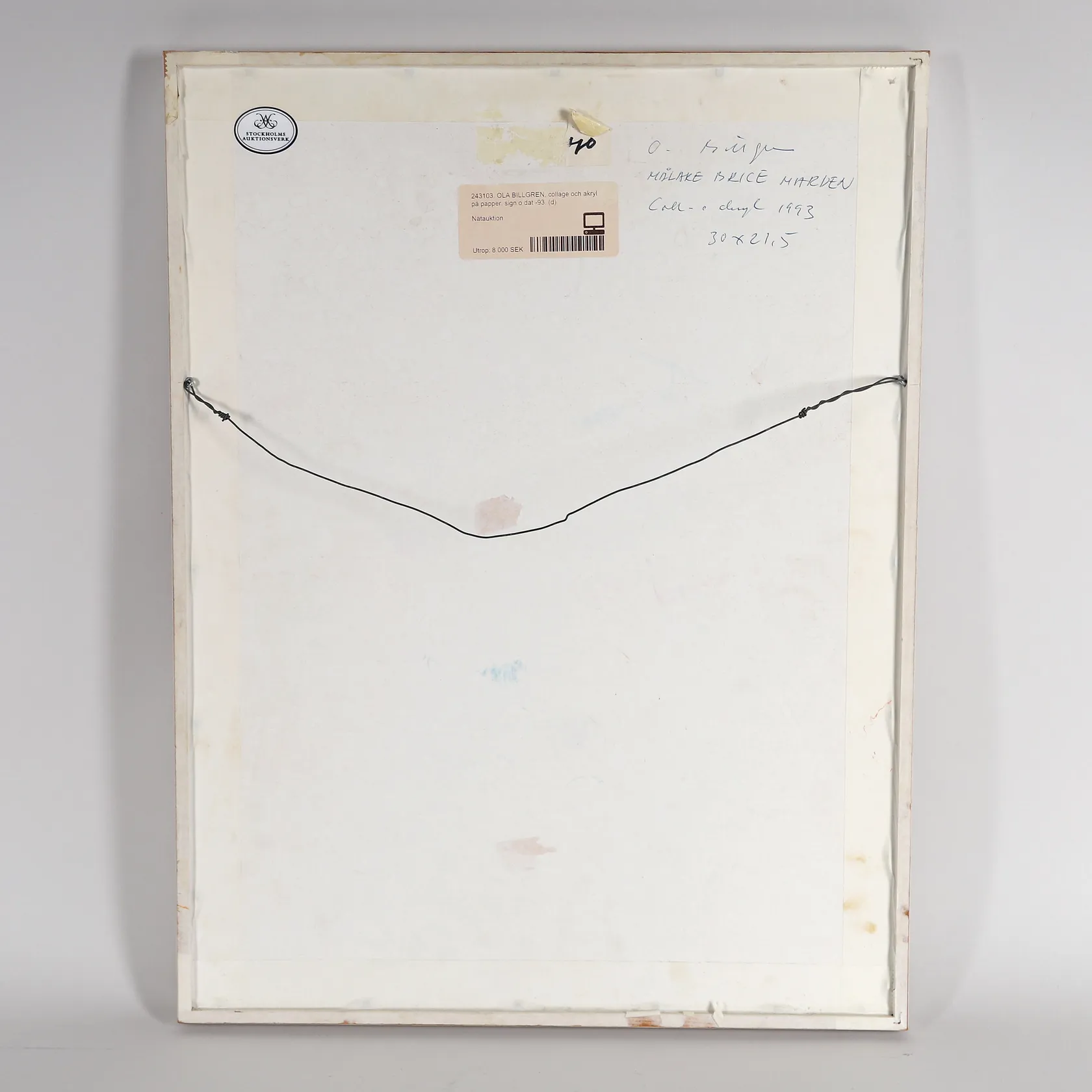Tavla Ola Billgren, collage och akryl på papper, signerad och daterad -93, "Målare Brice Marden", bladstorlek 29,5 x 21,5cm, ej examinerad ur ram. Skickas med postpaket. Omfattas av BUS-avgift.