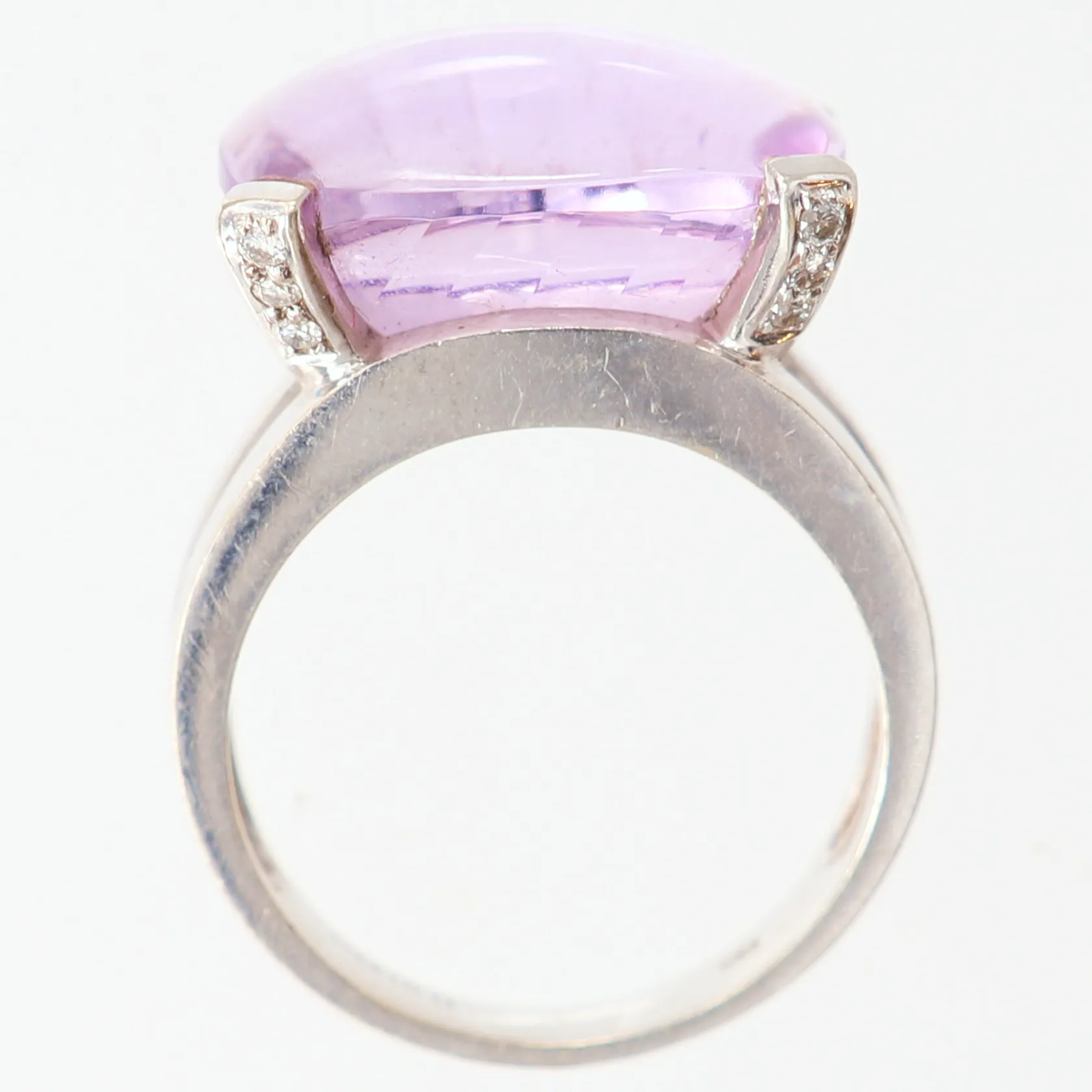 Ring med ljus ametist, nagg, briljantslipade diamanter 12 x ca 0,01ct, stl: 17½, bredd 3,5-13mm, 14K vitguld Vikt: 7,7 g.