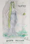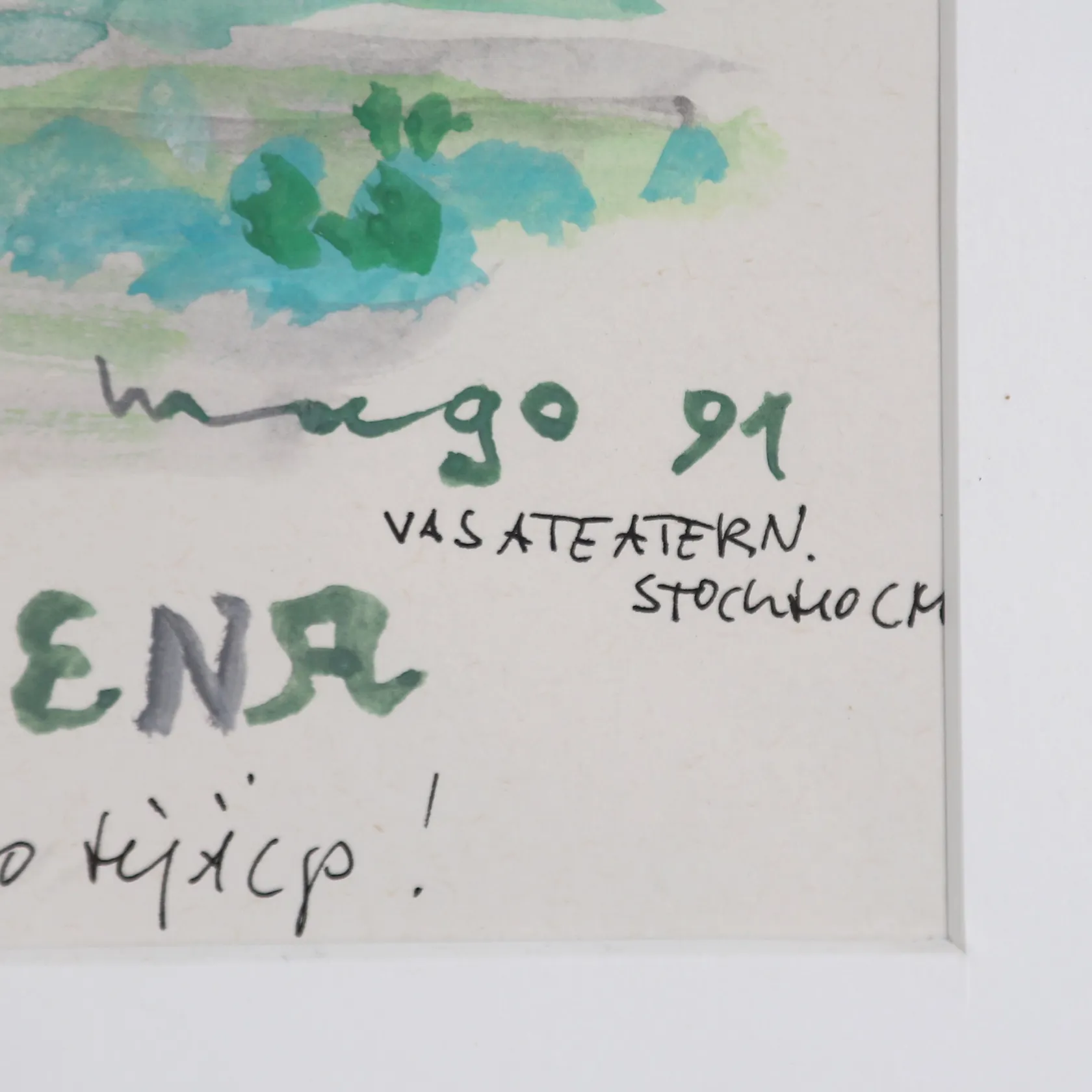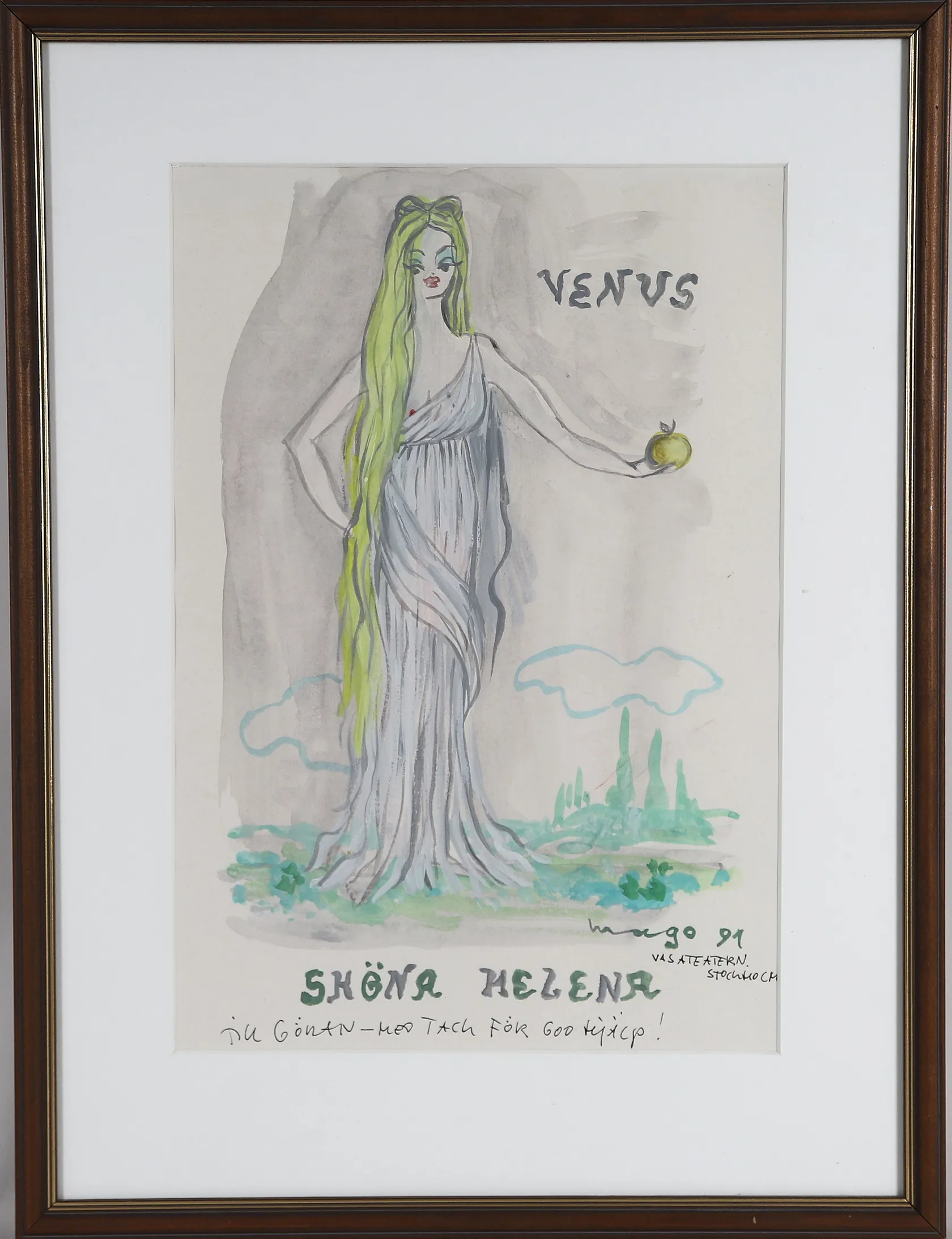 Tavla Max Goldstein (Mago), "Sköna Helena", akvarell, signerad Mago, dedikerad och daterad 91, Vasateatern, Stockholm, bildyta 32x22cm, ej examinerad ur ram. Skickas med postpaket. Omfattas av BUS-avgift.