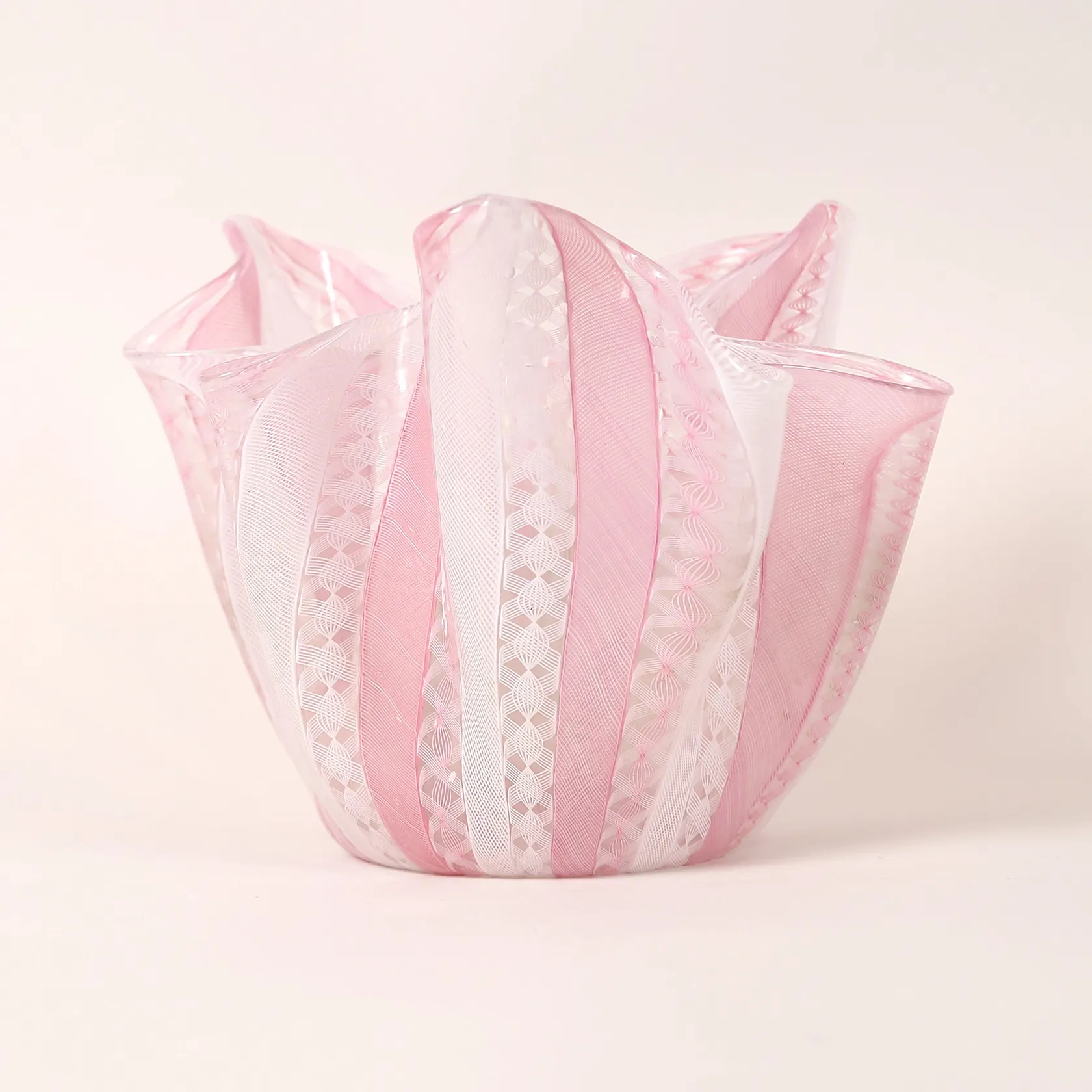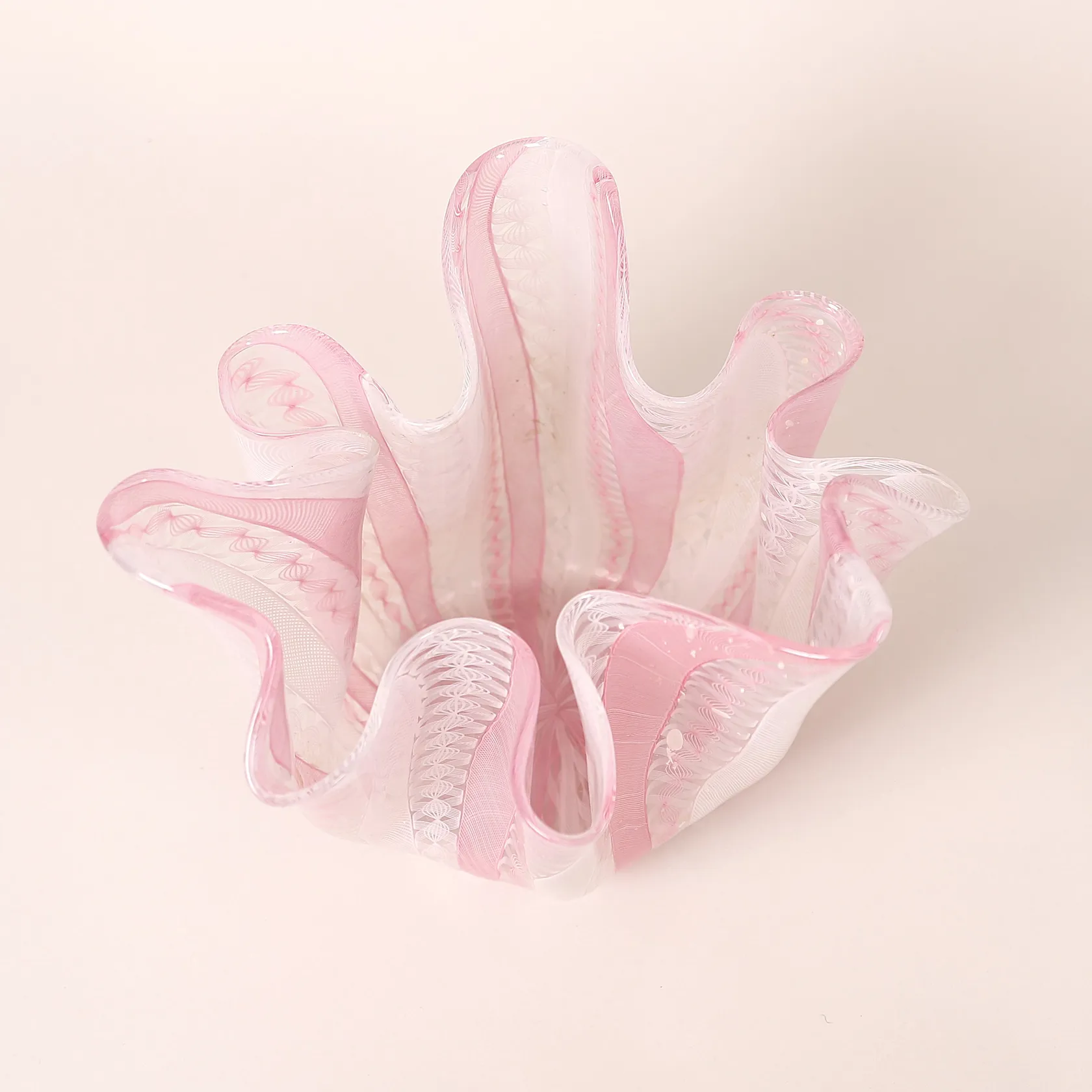 Skål, "Fazzoletto", Paolo Venini, Murano, glas, 1950-tal, så kallad Näsduksskål, dekor i rosa och vitt mot klar fond, undertill signerad Venini Murano ITALIA, ca Ø23-22, cm, höjd 19 cm. Skickas med postpaket.