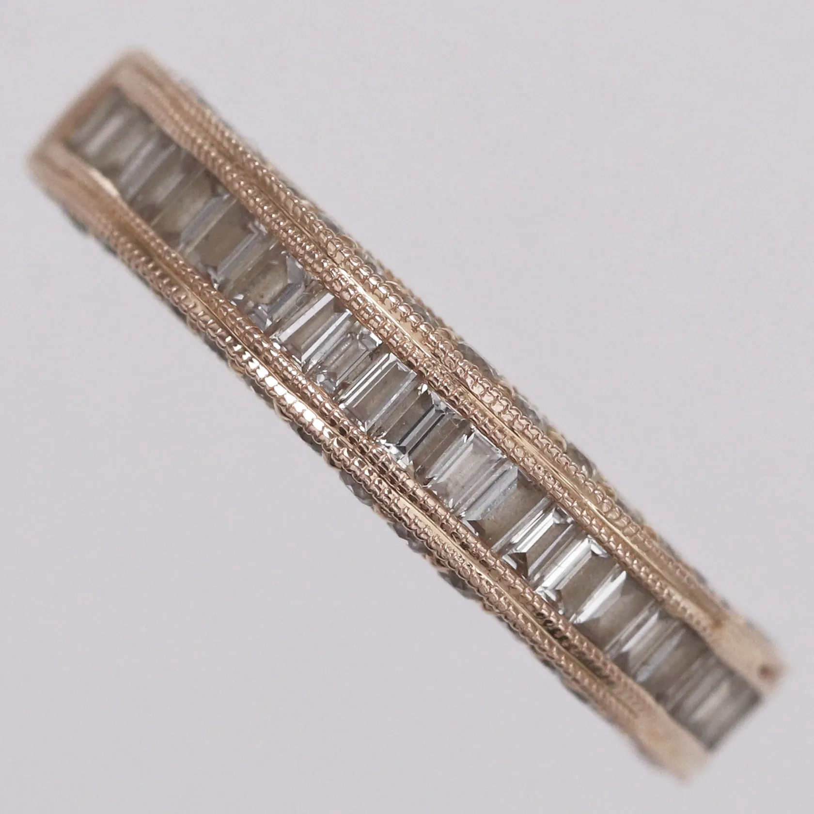 Ring diamanter 38 x ca 0,005- 0,01ct briljantslipade + ca 27 x ca 0,025ct baguetteslipade, stl:16¾, bredd 3,3-4,2mm, 18K Vikt: 4,3 g.