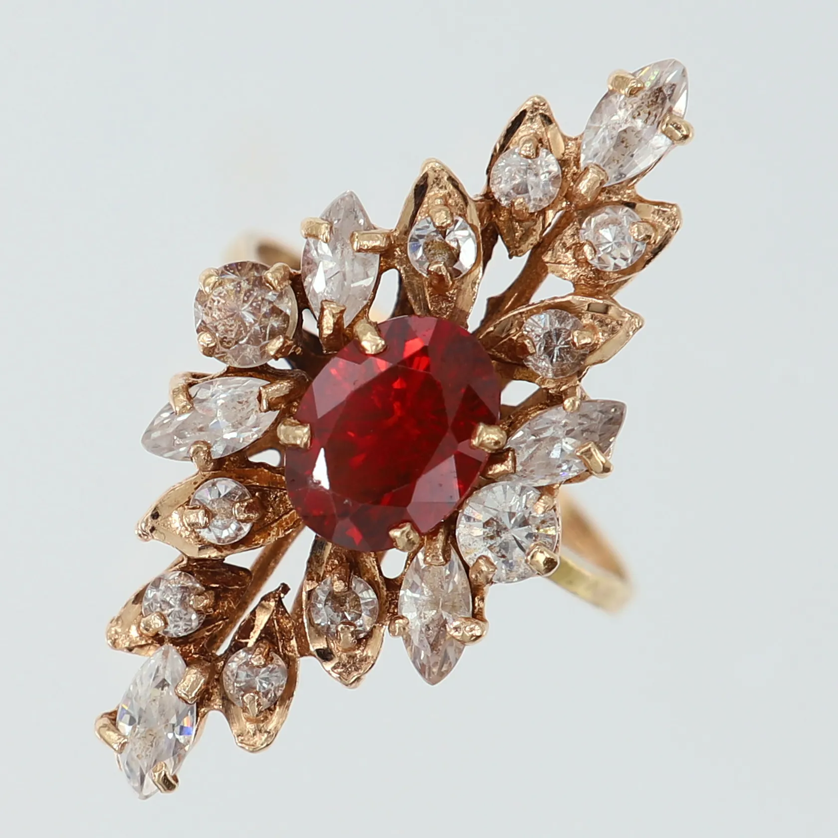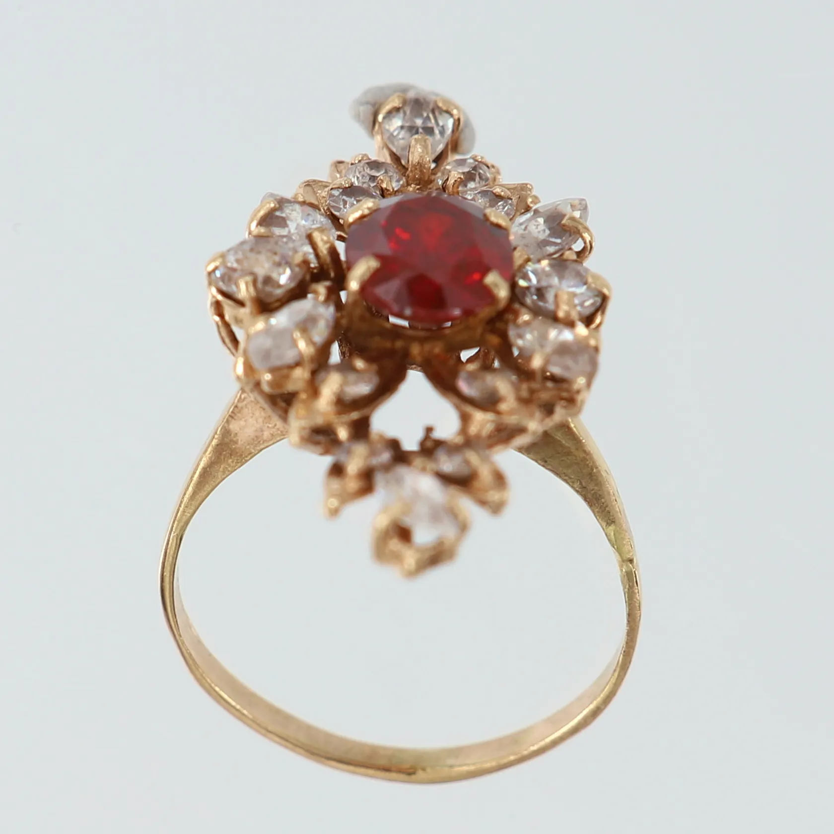 Ring med röd samt vita stenar, stl: 16¾, bredd 1,7-30mm, några stenar lösa, 14K. Vikt: 3,8 g.