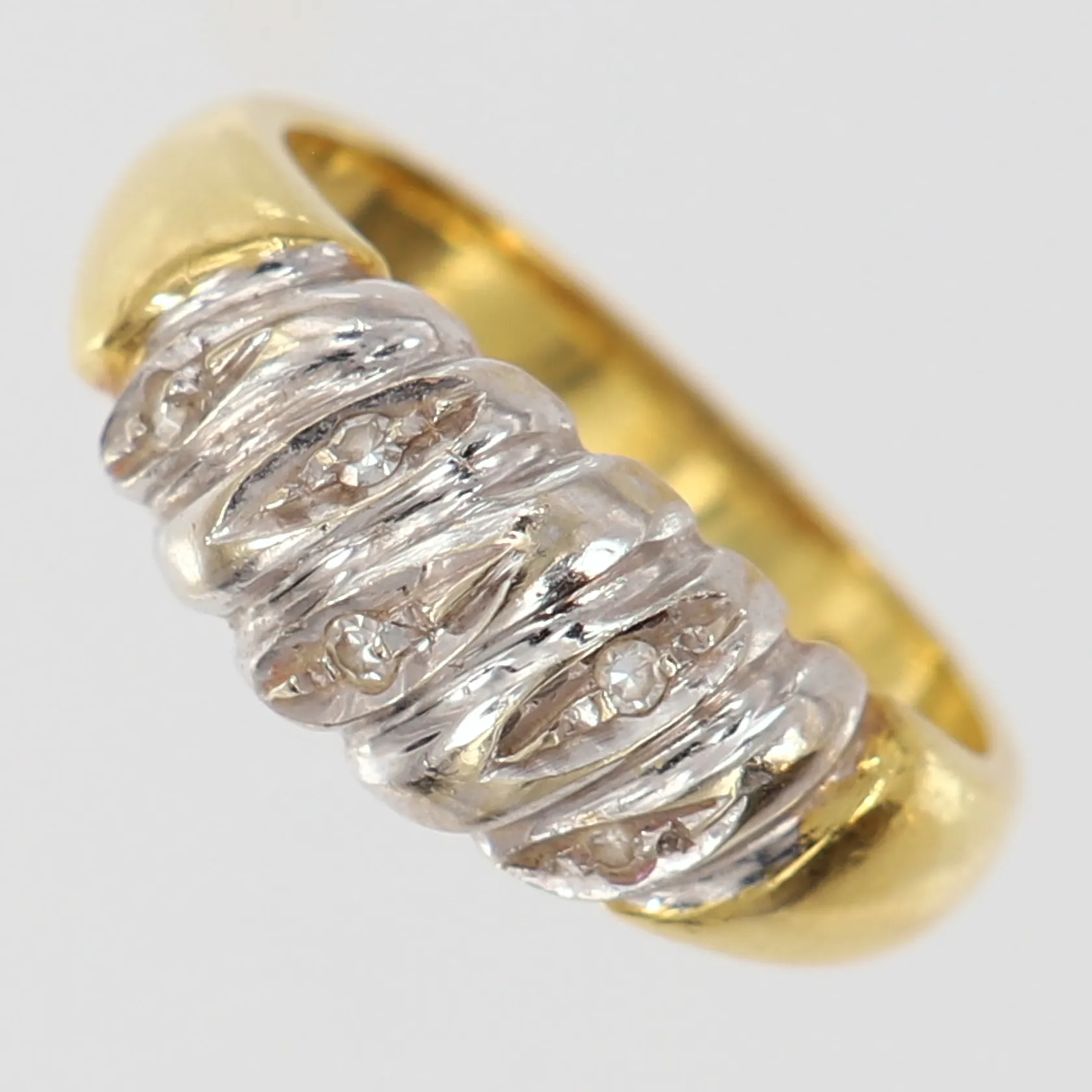 Ring med 8/8-slipade diamanter 5 x 0,01ct, stl: 16¾, bredd 2,7-7,5mm, tvåfärgat 18K. Vikt: 4,4 g.