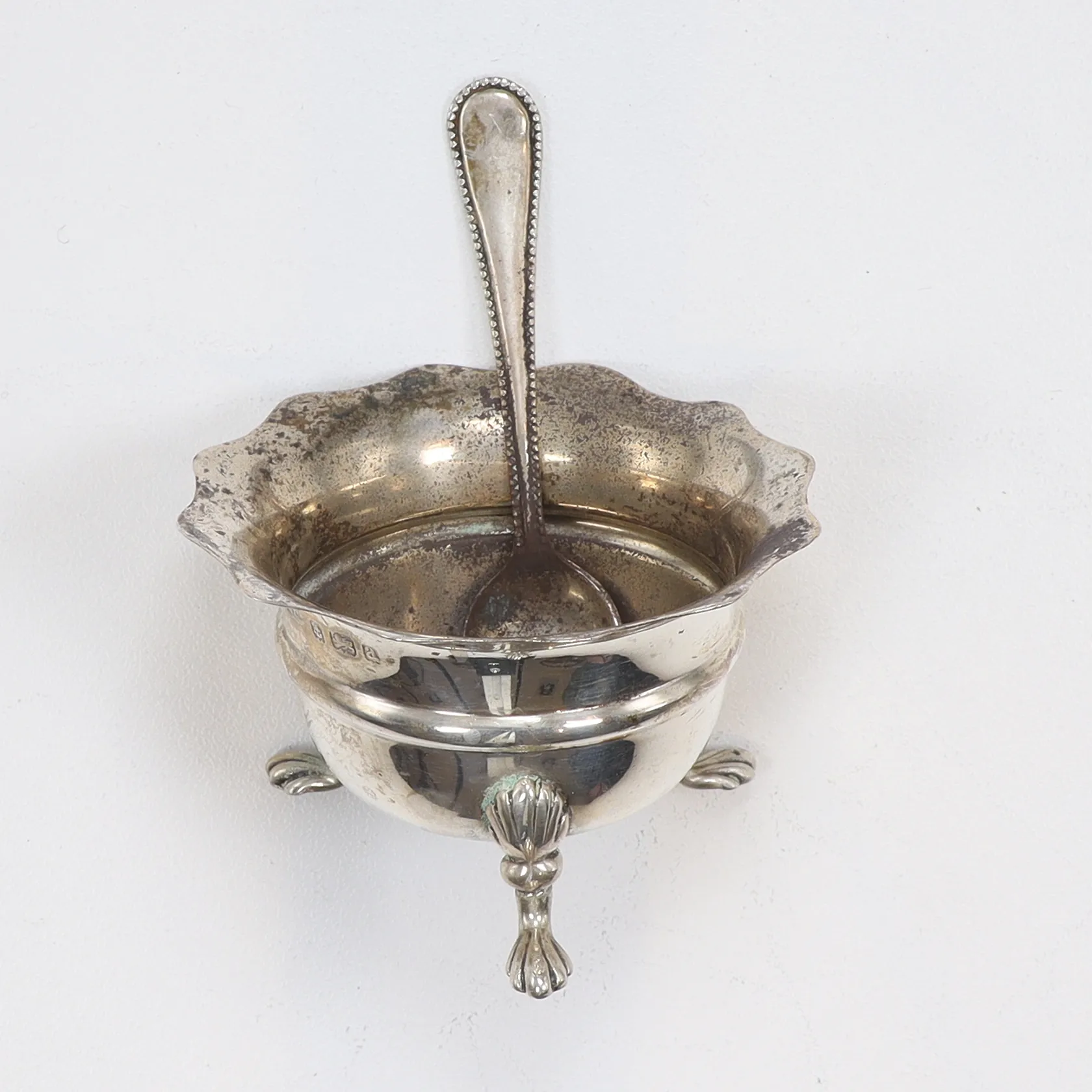 Saltkar med sked höjd 3,7cm bredd 6,1cm, med slitage, W&D England Birmingham 1900-talets första hälft Vikt: 36,8 g.