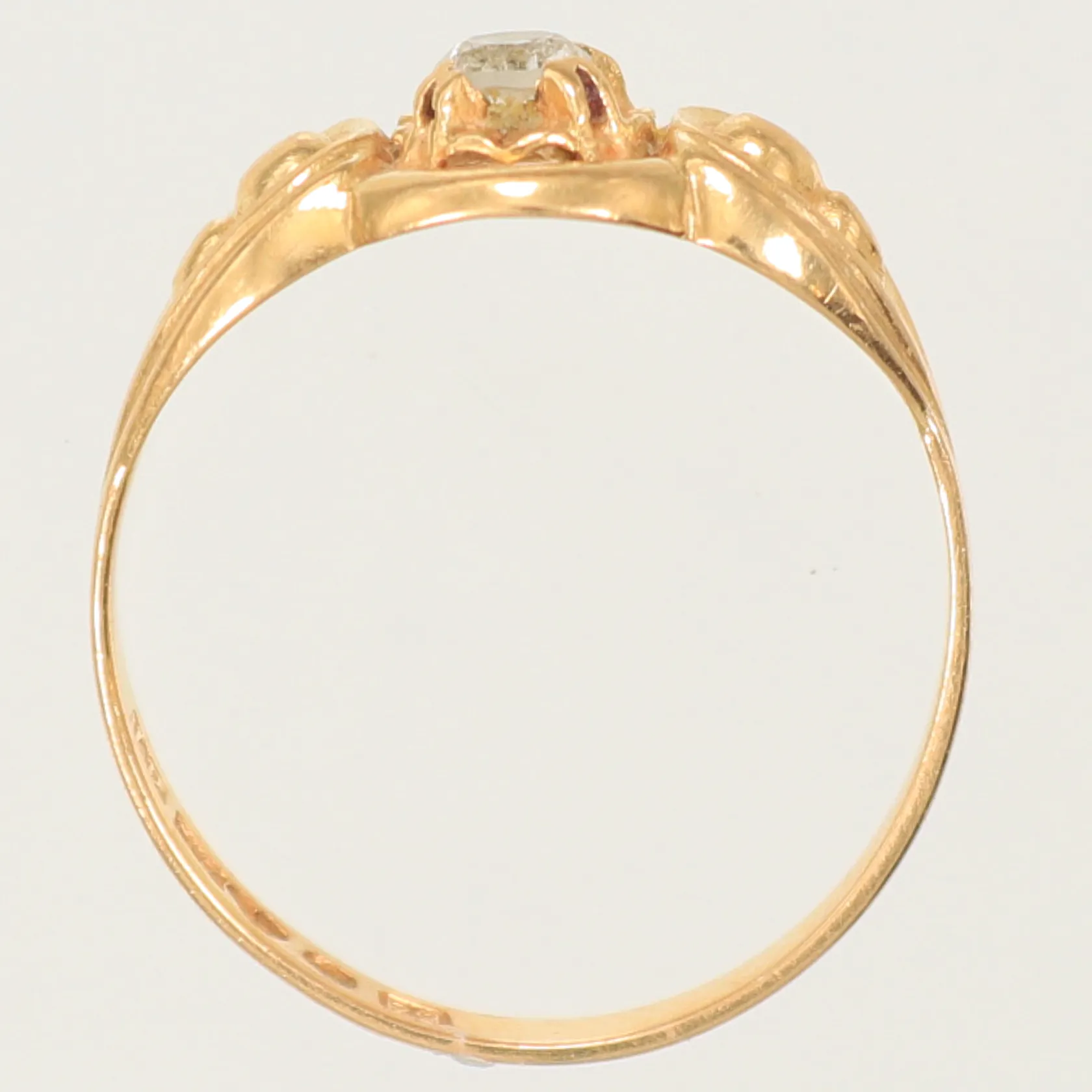 Ring med mönster och vit sten, stl ca 16¾, bredd 2-9mm, 18K, 1,9g Vikt: 1,9 g.