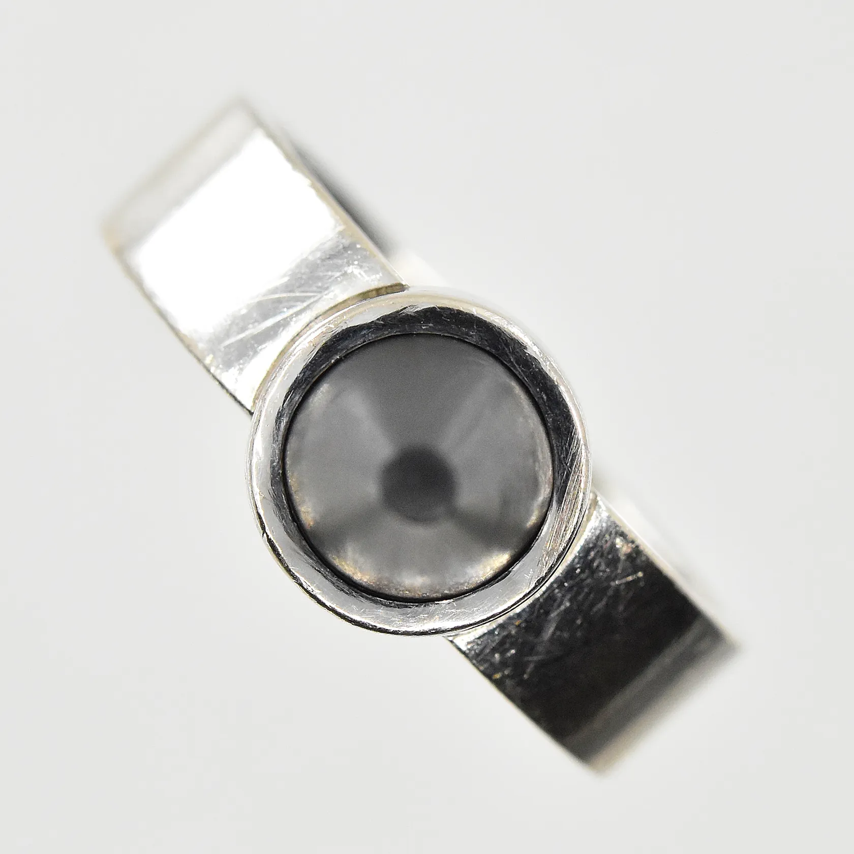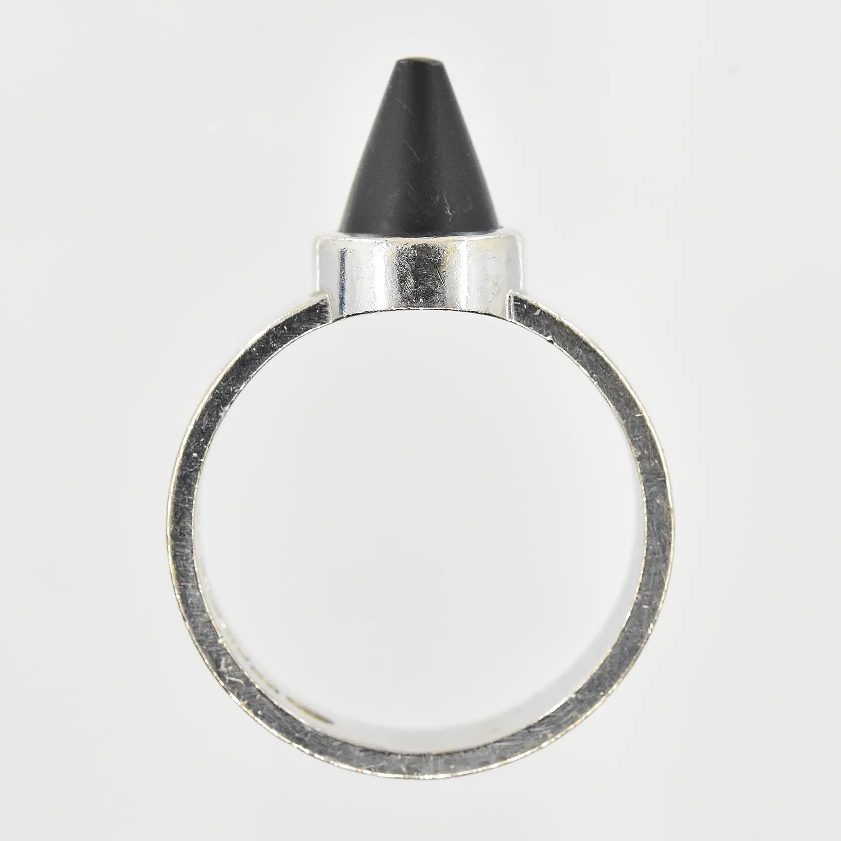 Ring med spetsslipad matt onyx, stl: 20, bredd 6mm, tillverkad av Eskilstuna Guldsmedsverkstad AB 2016, 18K vitguld. Vikt: 10,2 g.