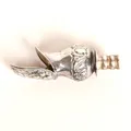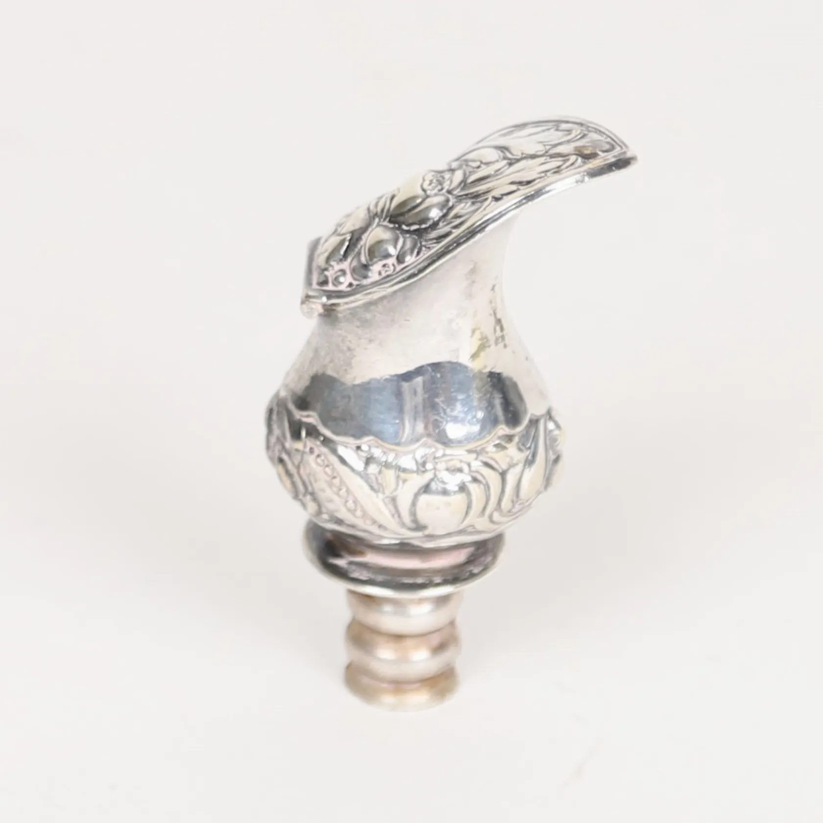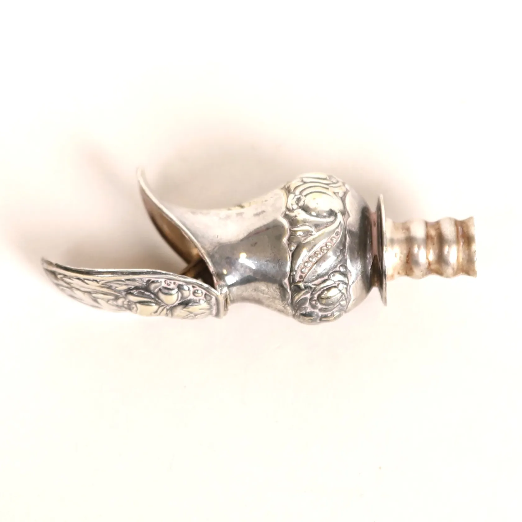 Flaskpip med organisk dekor, höjd: 71 mm, bredd: ca 40 mm, nedre mynning Ø13 mm, saknar stämplar, slitage, silver. Vikt: 28,7 g.