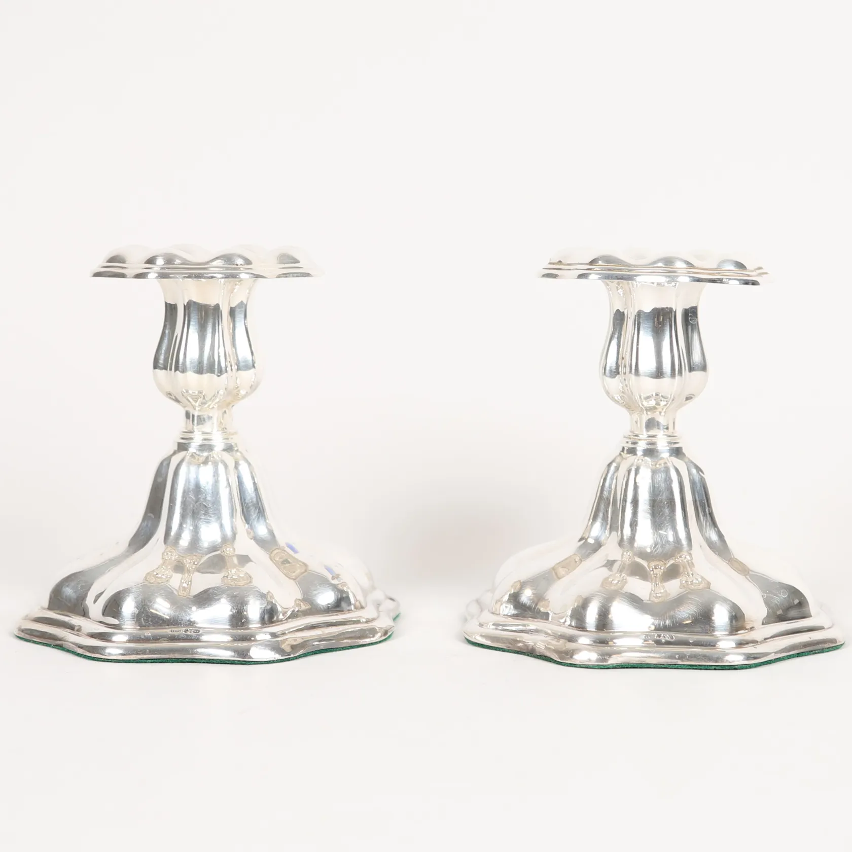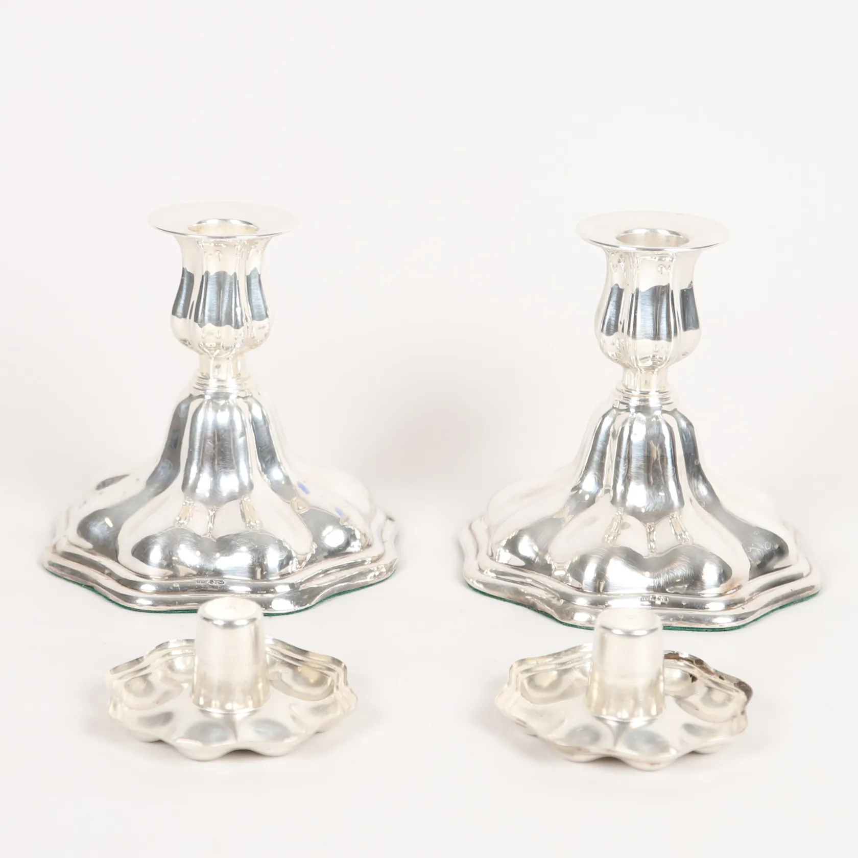 Ett par ljusstakar, C. G. Hallbergs Guldsmedsaktiebolag, Stockholm år 1958, höjd: 12 cm, Ø 8 - 13 cm, fyllda, silver. Bruttovikt: 992,4g