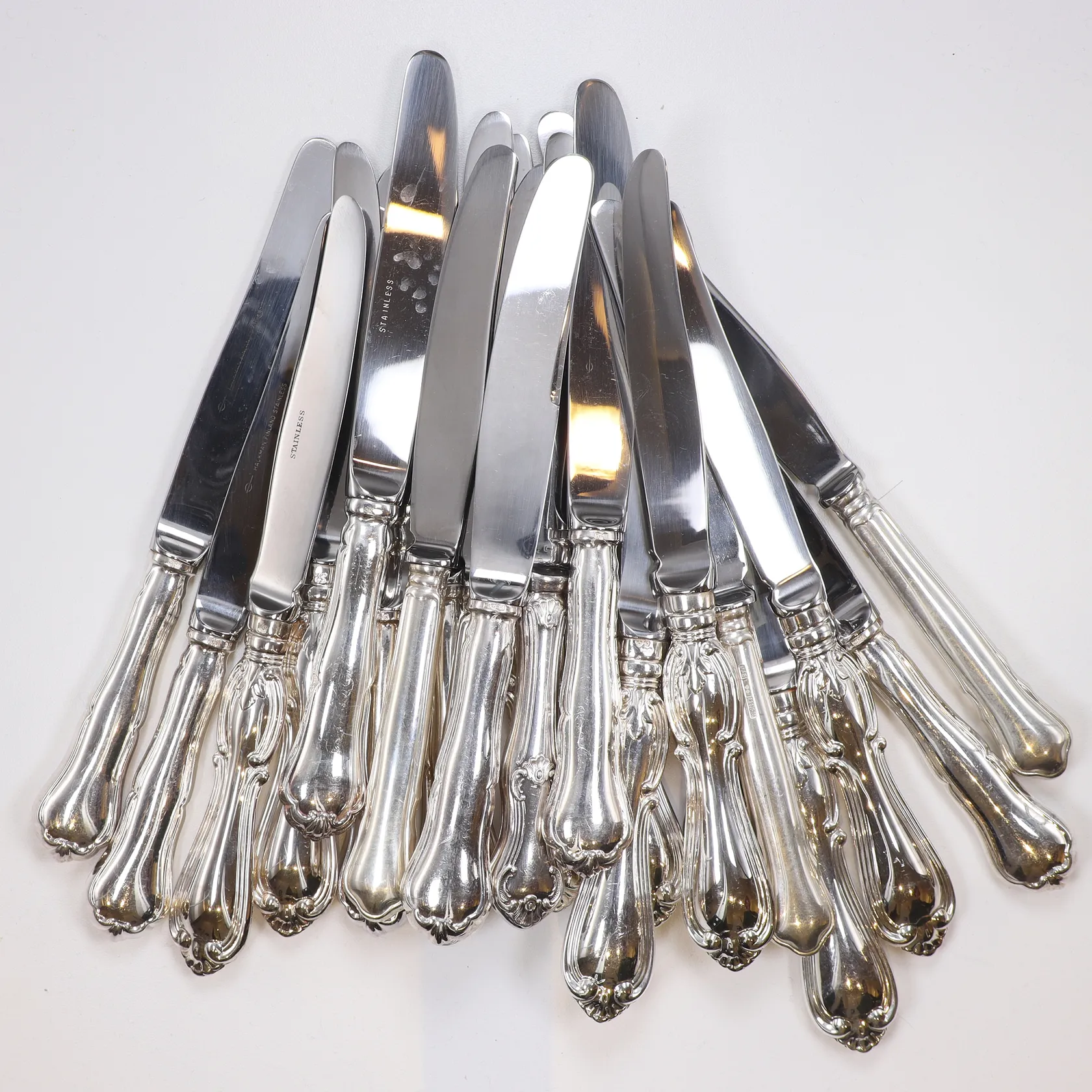 21st Matknivar olika modell längd 20-21cm, blad i rostfritt stål, handtag i silver 830/1000 Vikt: 1480,3 g.
