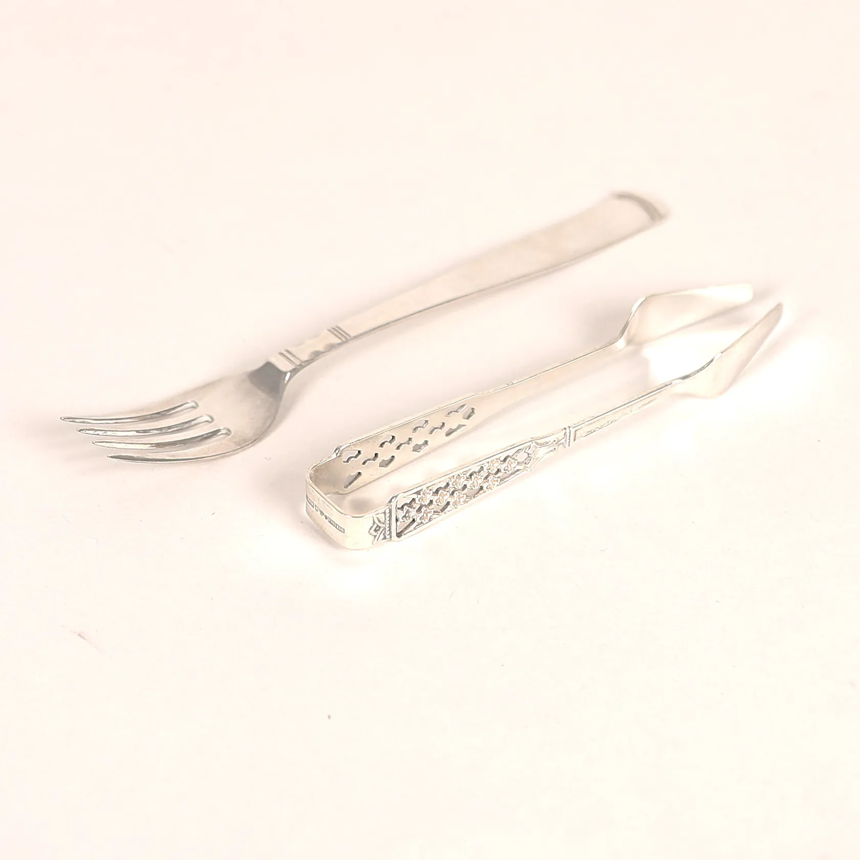Smörgåsgaffel och kaktång, gravyr, längd 15 respektive 11cm, silver. Vikt: 39,9 g.