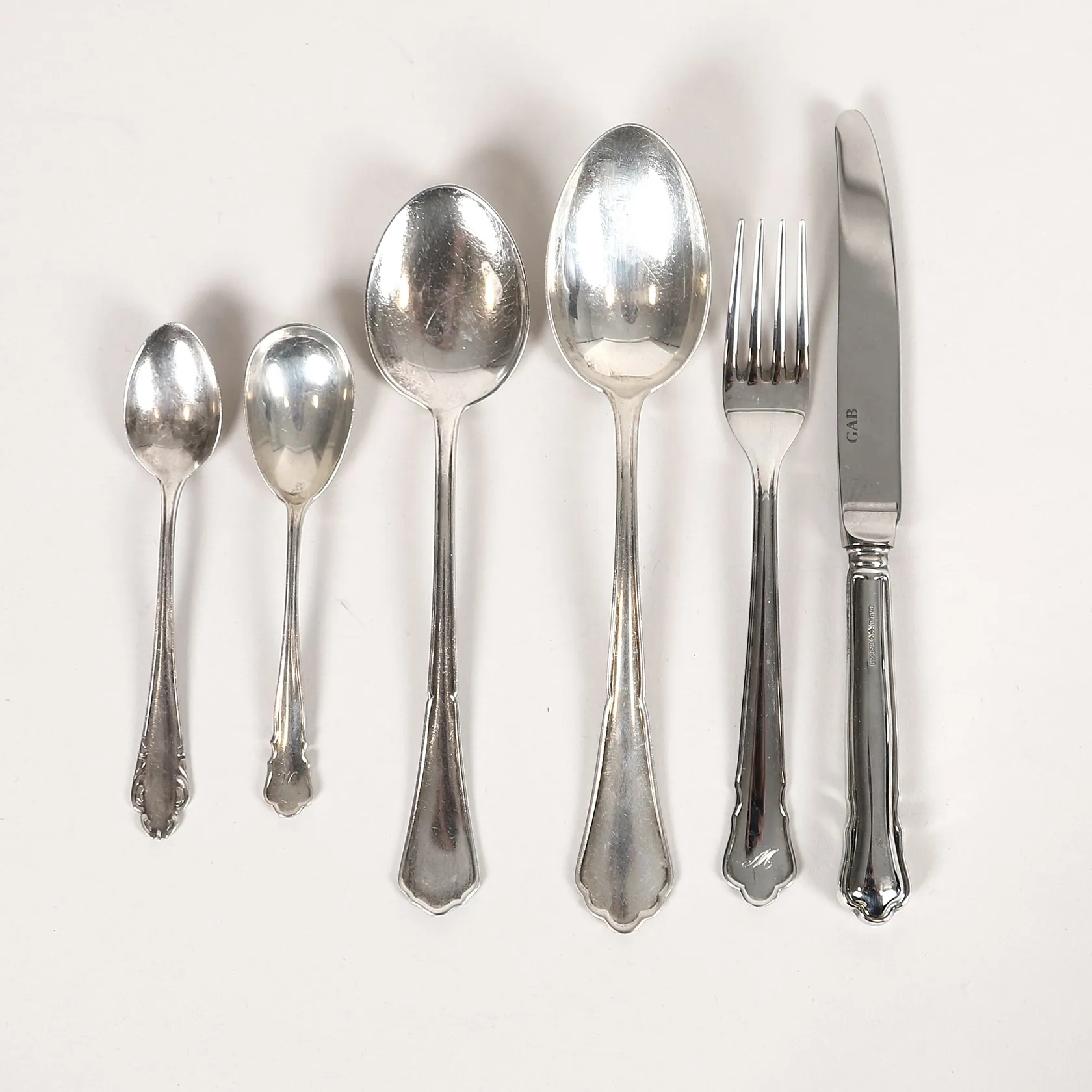 Diverse silver, smörgåskniv, smörgåsgaffel, fyra skedar olika storlekar, samtliga graverade, silver och stålblad, bruttovikt 164,4g