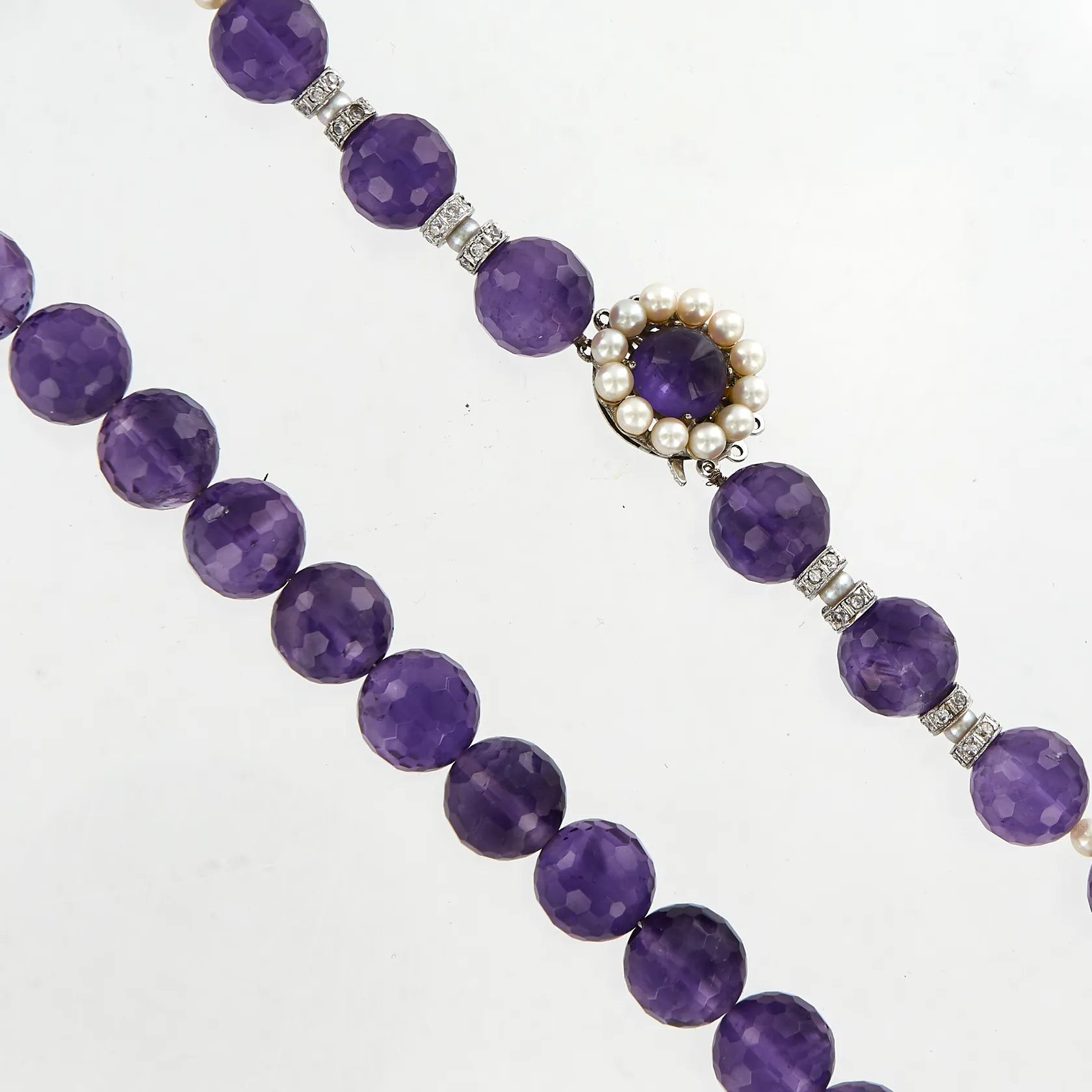 Collier med fasettslipade ametister och odlade pärlor, längd ca 47cm, lås i 925/1000 Silver från JKa, ametister ca Ø12mm, finns för visning på kontoret Östermalm