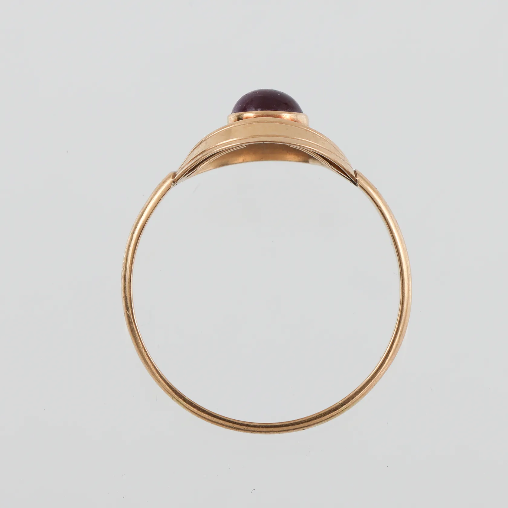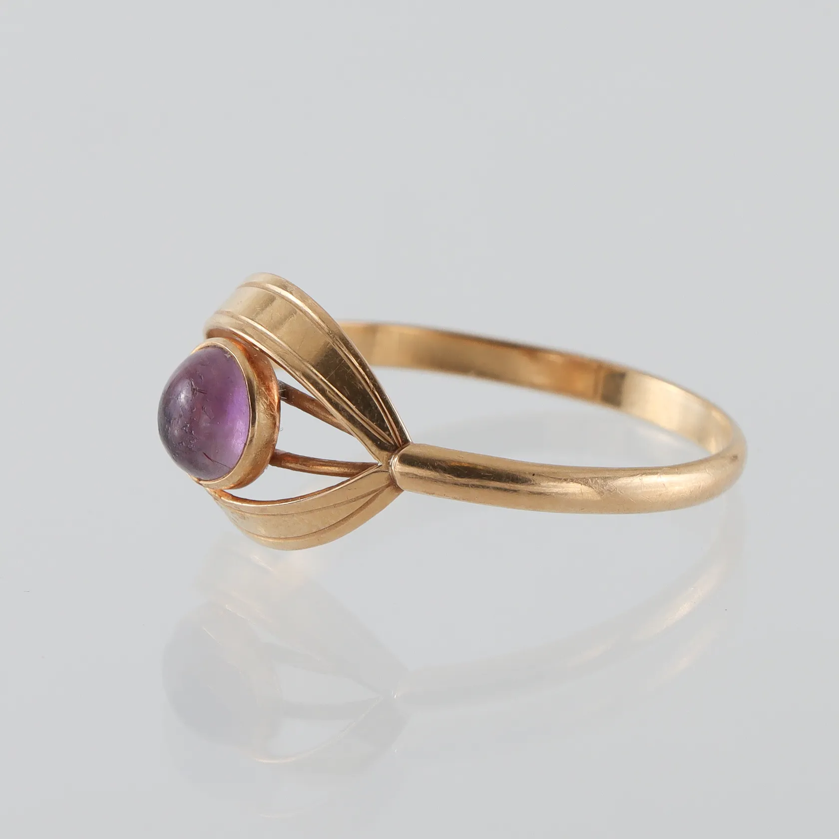 Ring 18k med ametist, Guldvaruhuset Stockholm, stl:21½, bredd 2.1-17.4 mm, 18K. Vikt: 2,5 g.