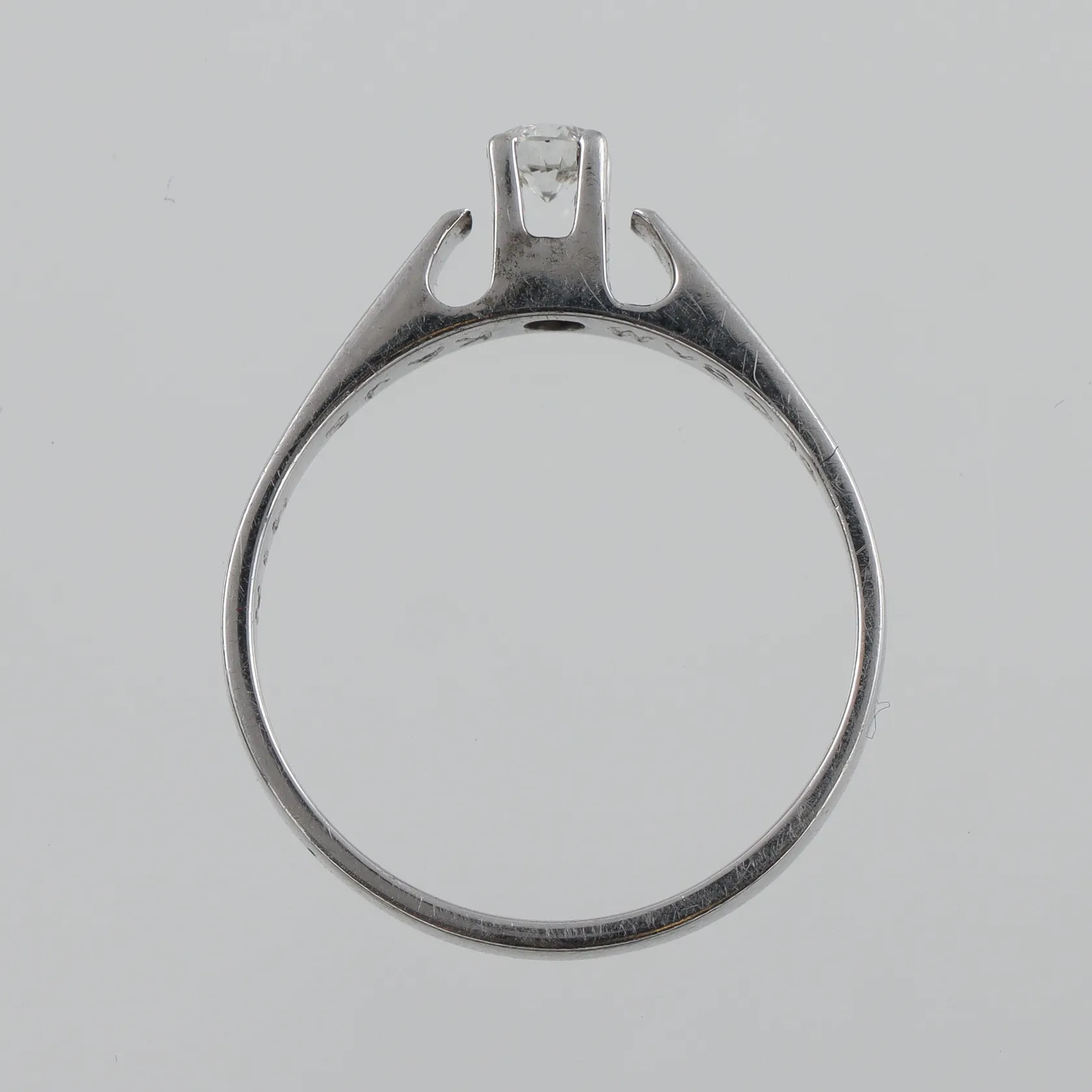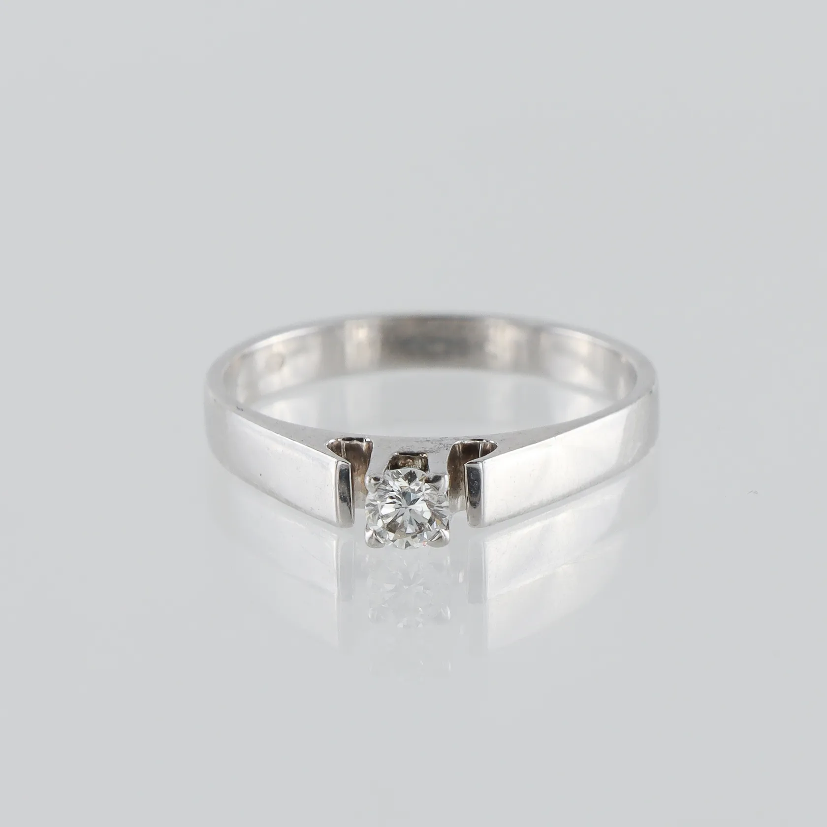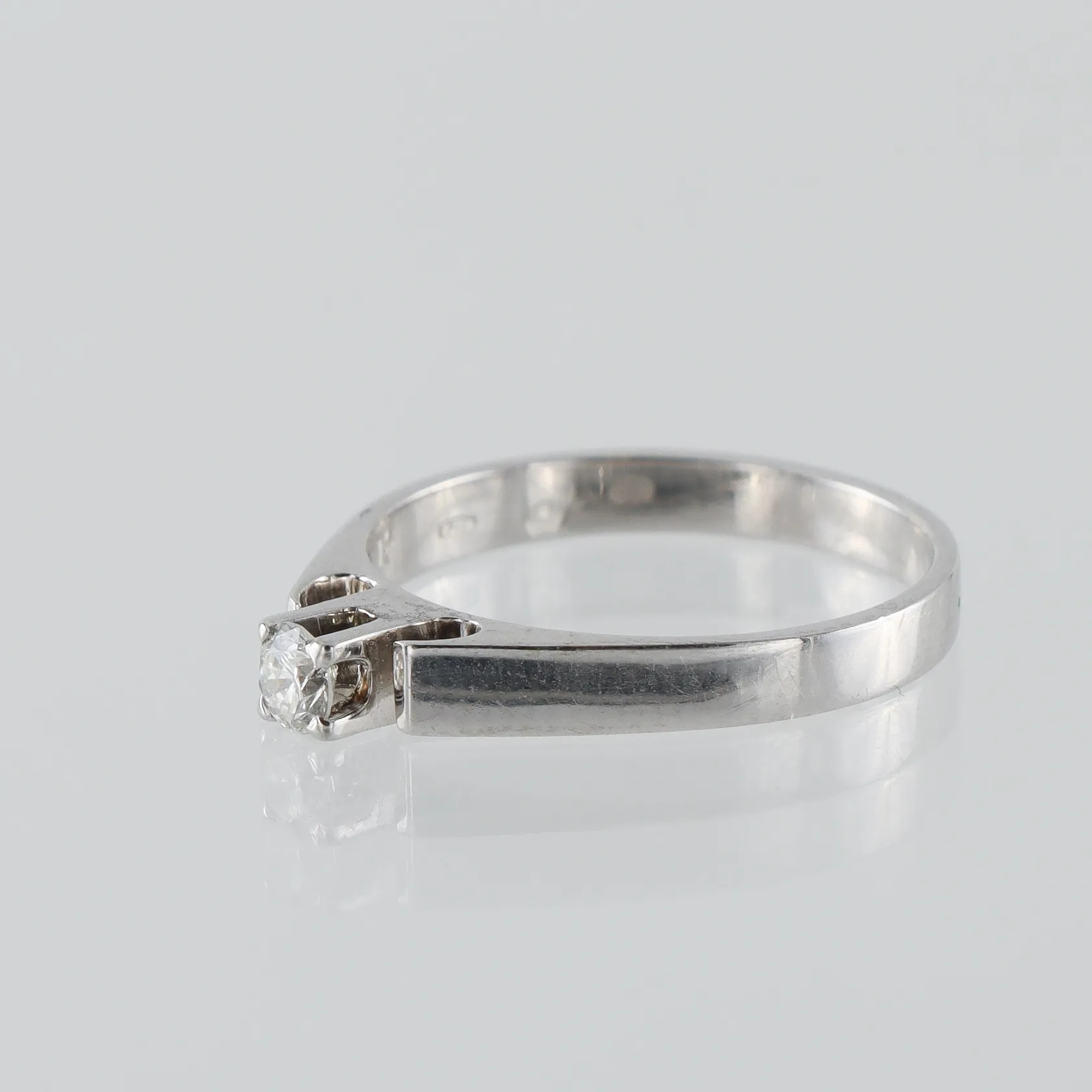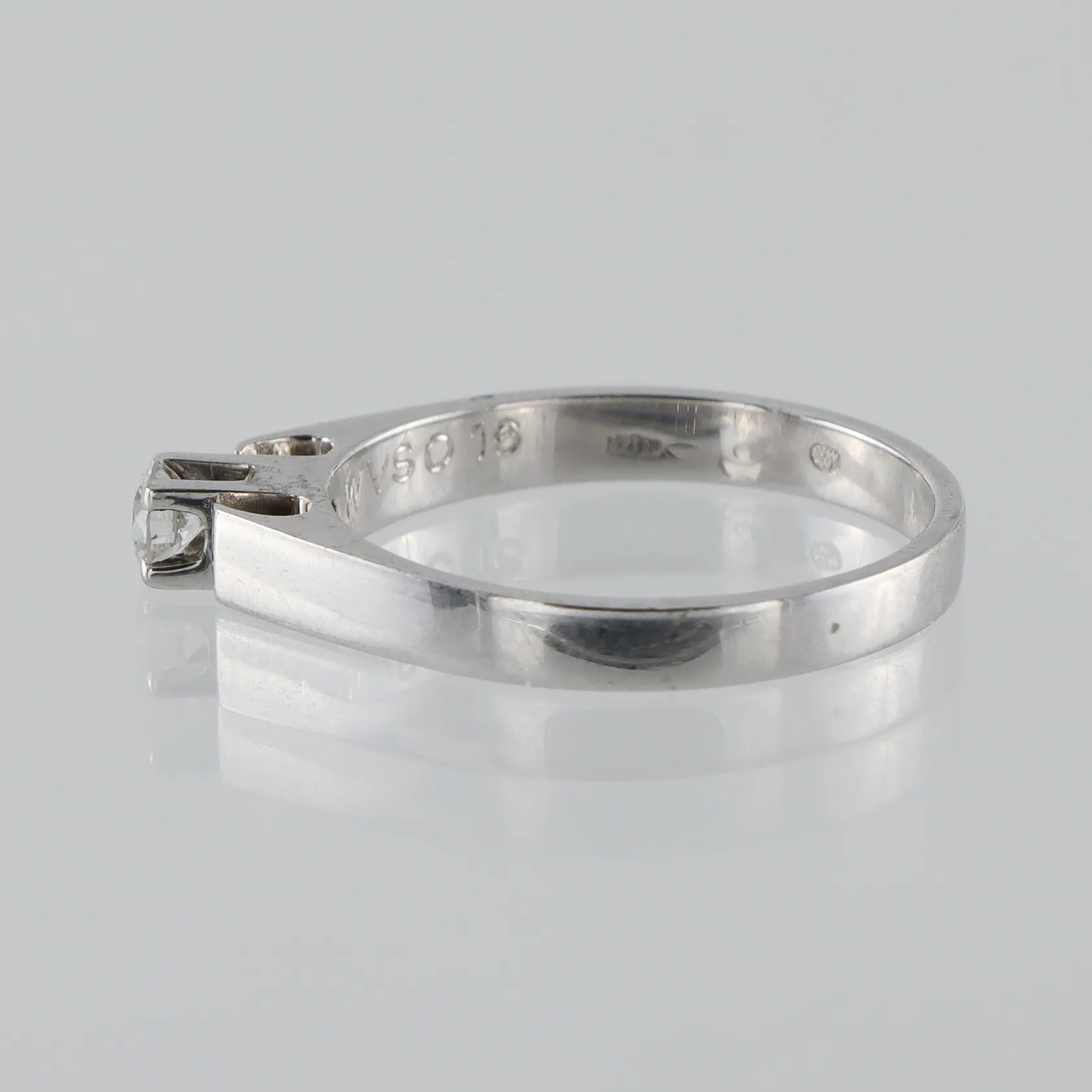Ring 18k vitguld med solitär naturell diamant på 0.16 ct WVS enligt inskription, gravyr, stl:17, bredd 2.5-3.3 mm. Vikt: 2,8 g.