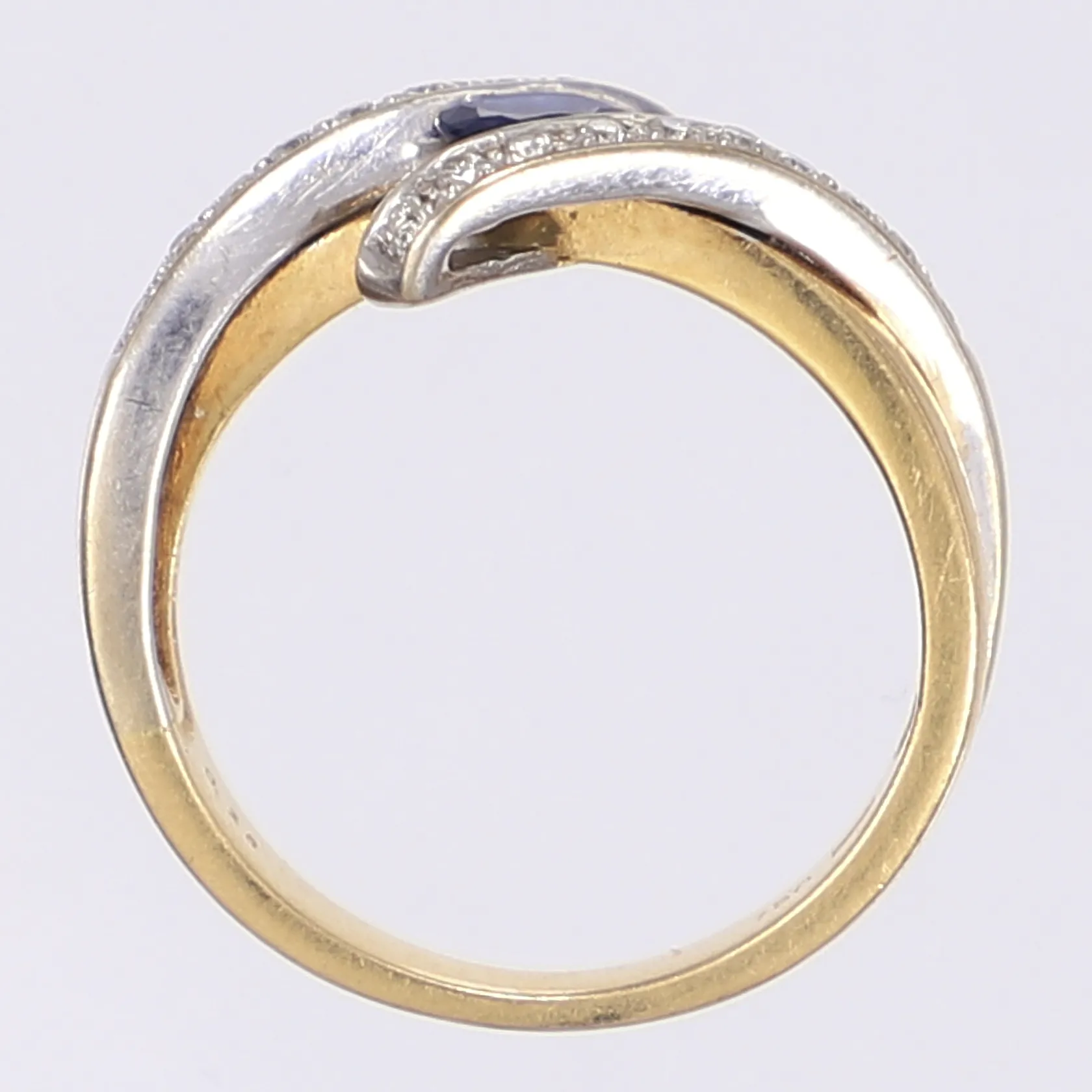 Ring med blå sten samt dia tot 0,20ctv enl gravyr tvåfärgad GHA stl 17¾ bredd 3-8mm 18K Vikt: 5,5 g.