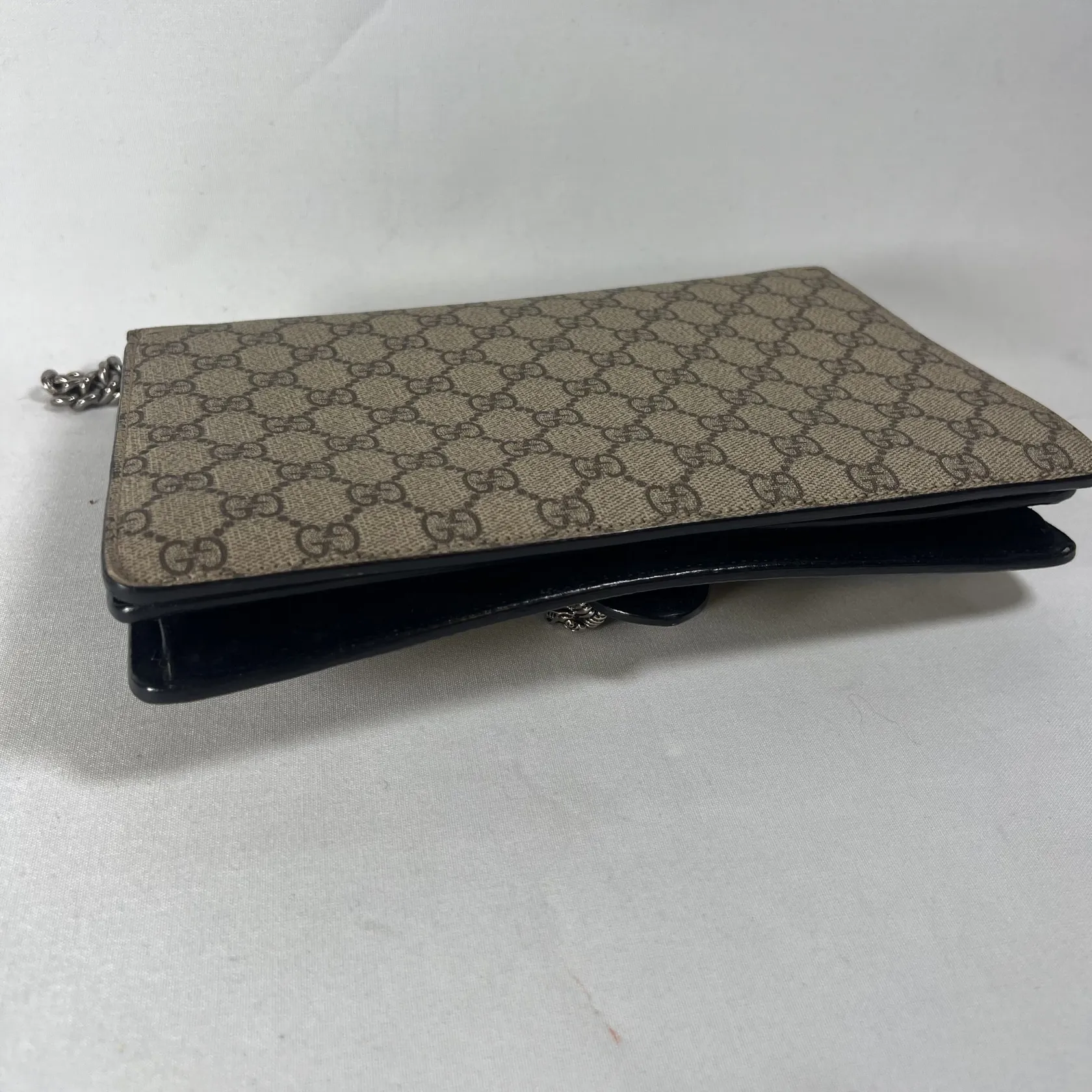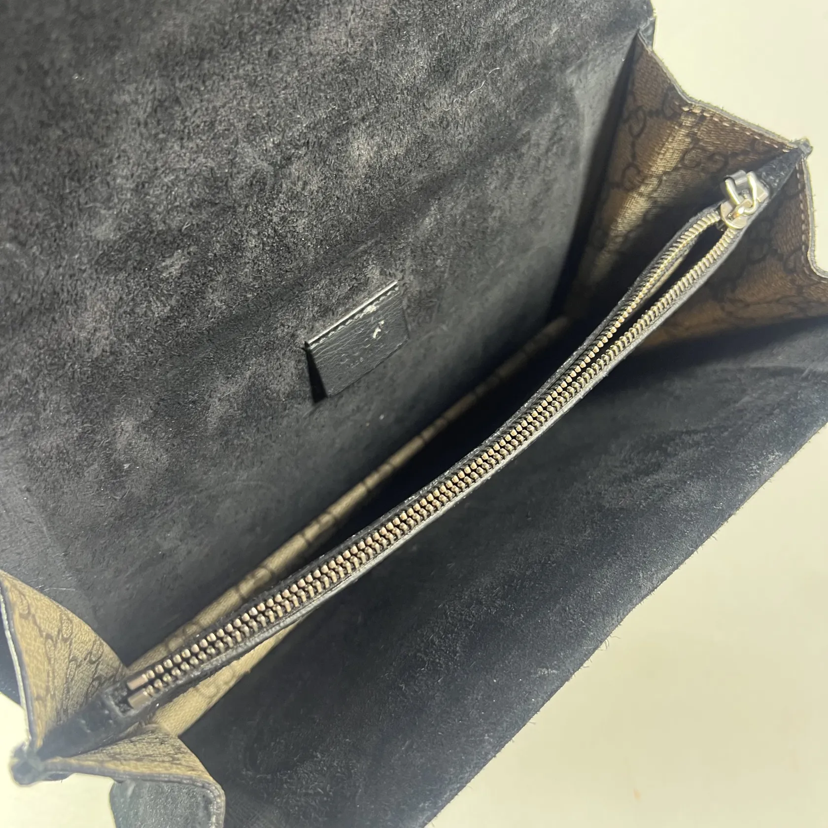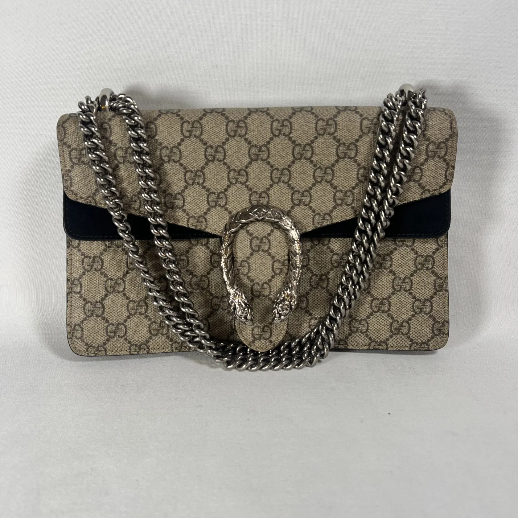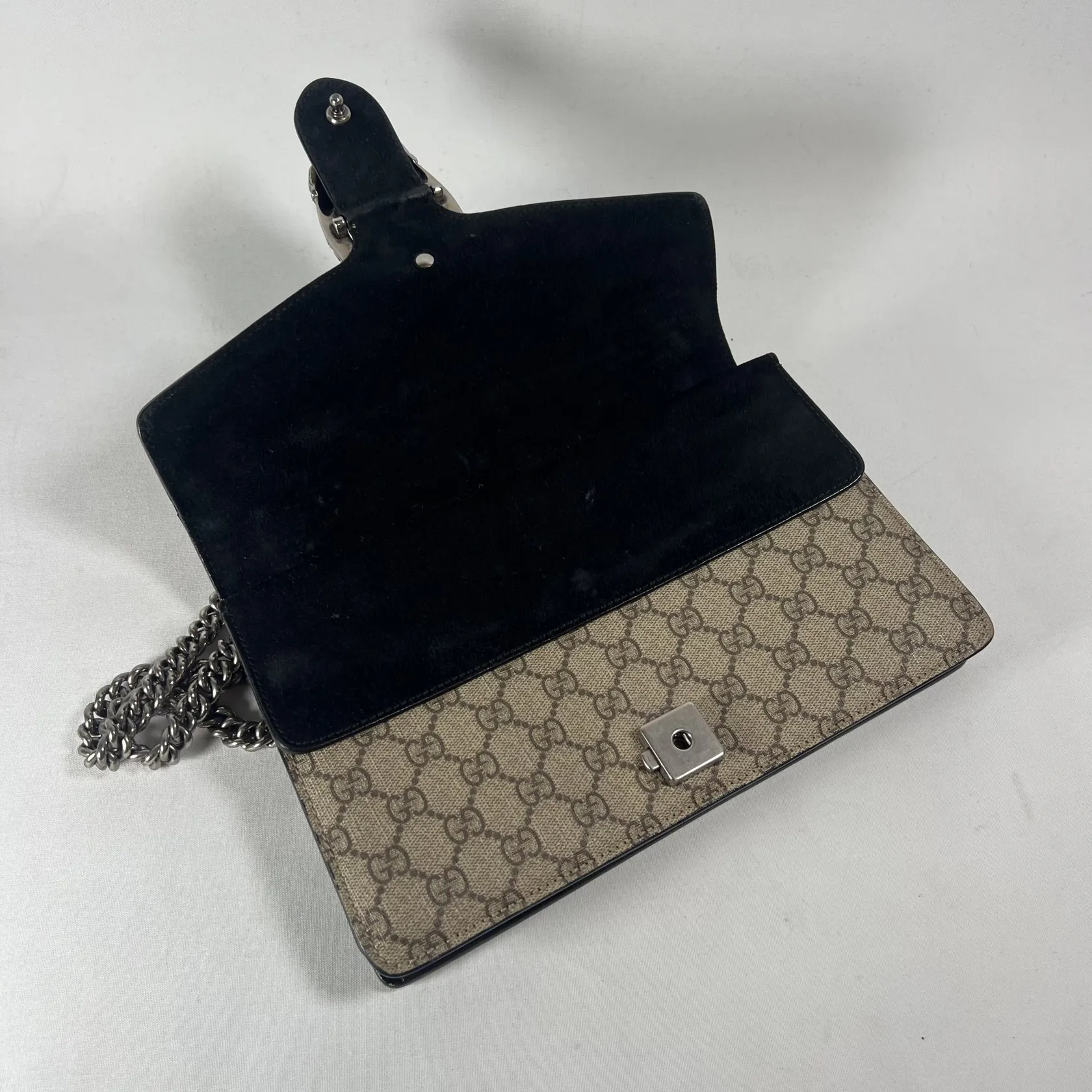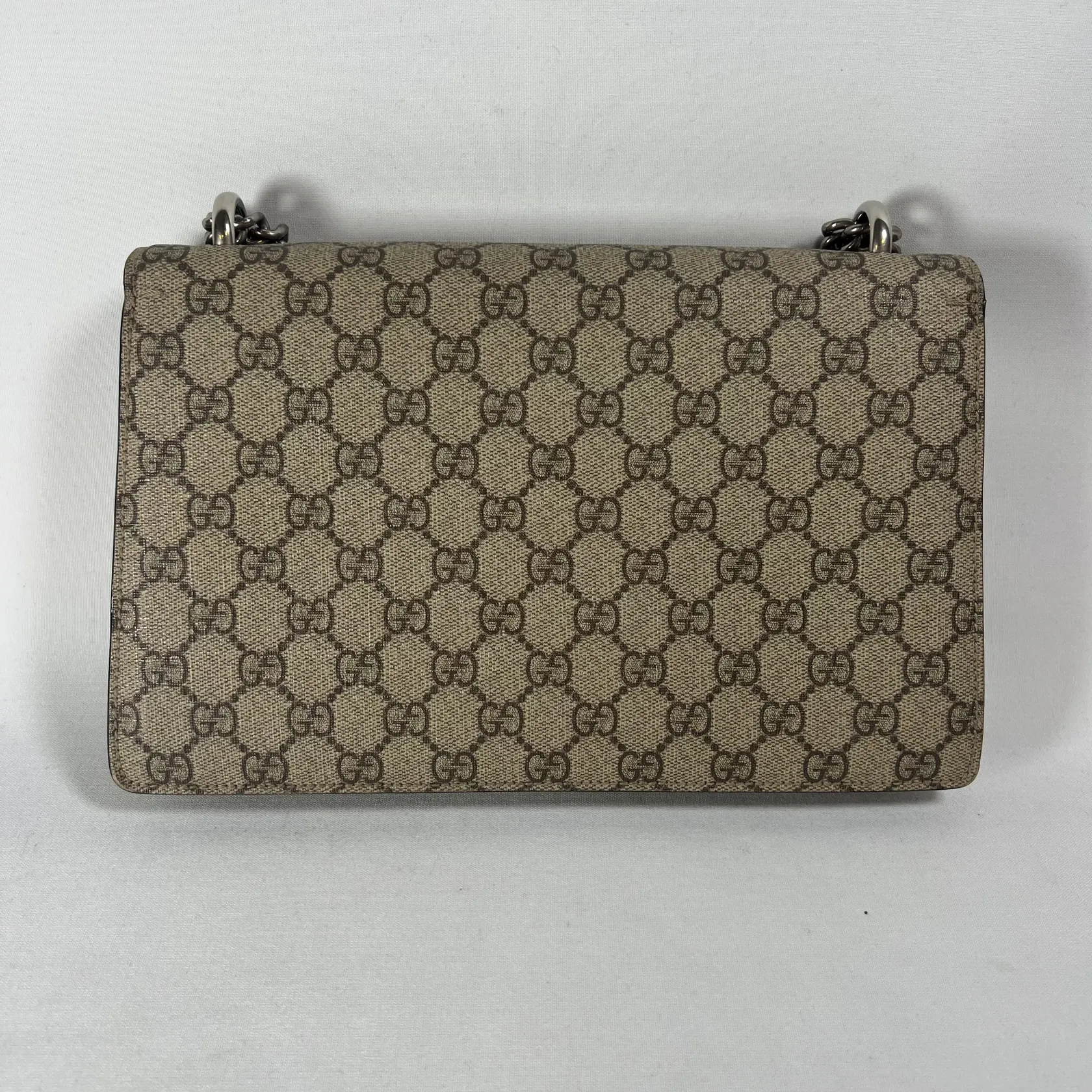 Väska Gucci Dionysus GG Supreme monogramcanvas 28x18x8cm beslag i vitmetall bruksslitage fläckar invändigt inga tillbehör