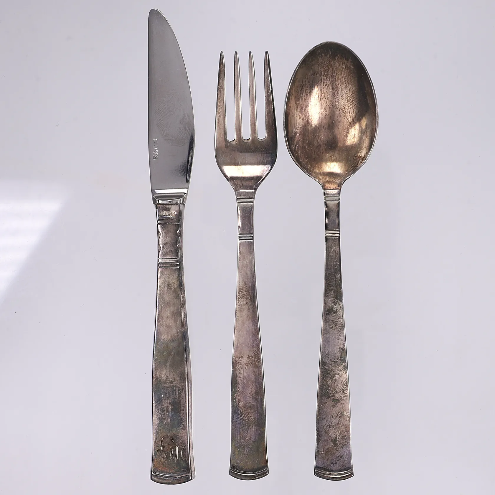 Bestick Rosenholm, kniv, gaffel och sked, 15-16cm, graverade, kniv med blad i rostfritt stål samt fyllt handtag, silver 830/1000 Bruttovikt: 96,5g Vikt: 96,5 g.