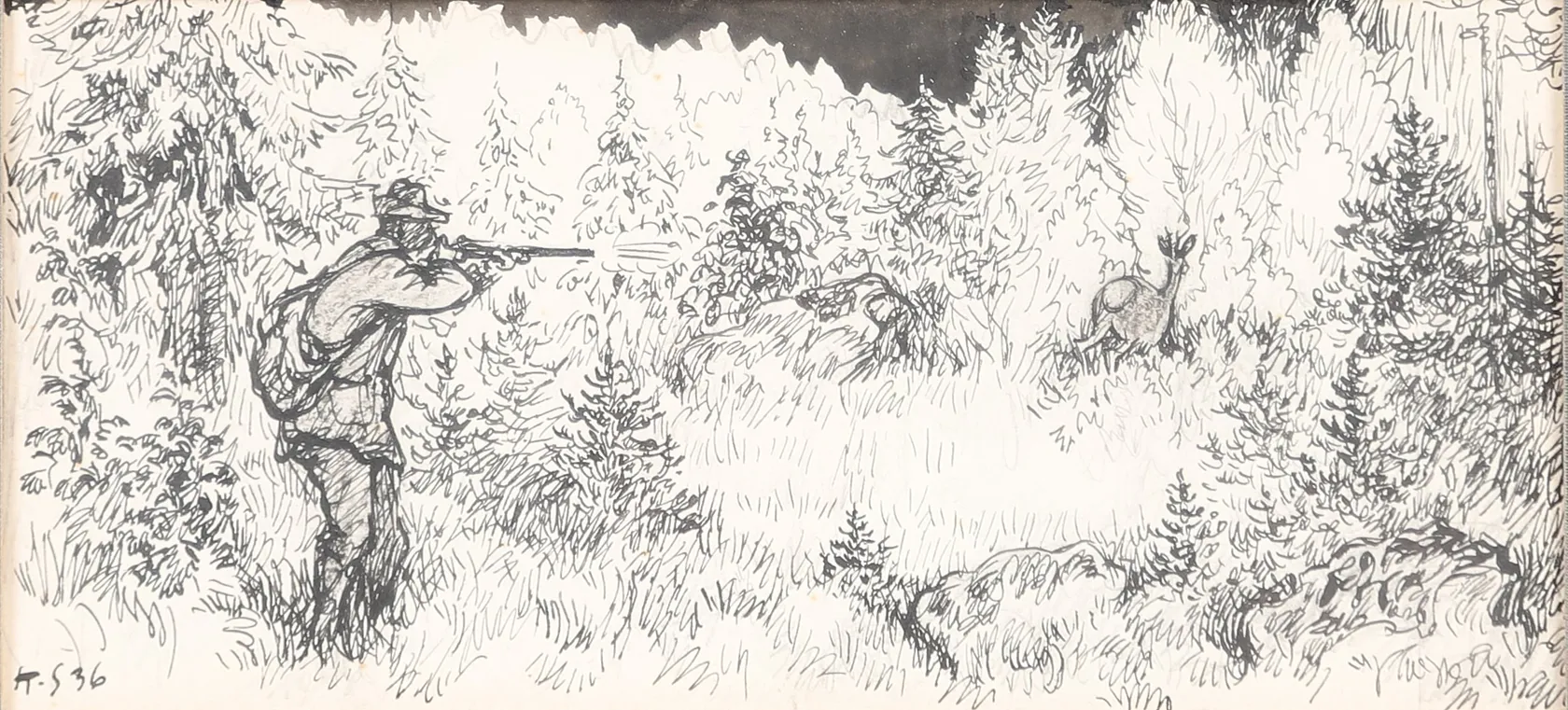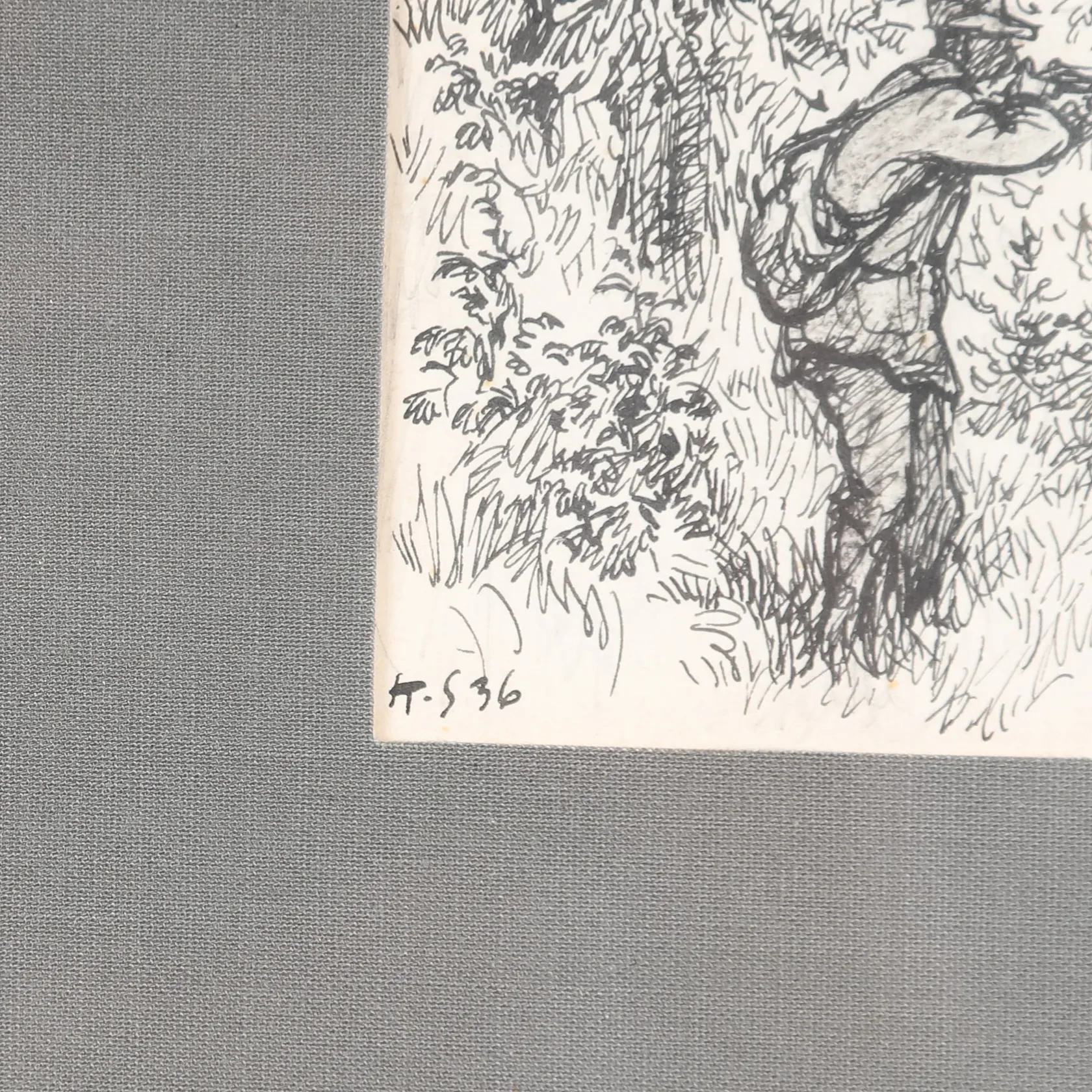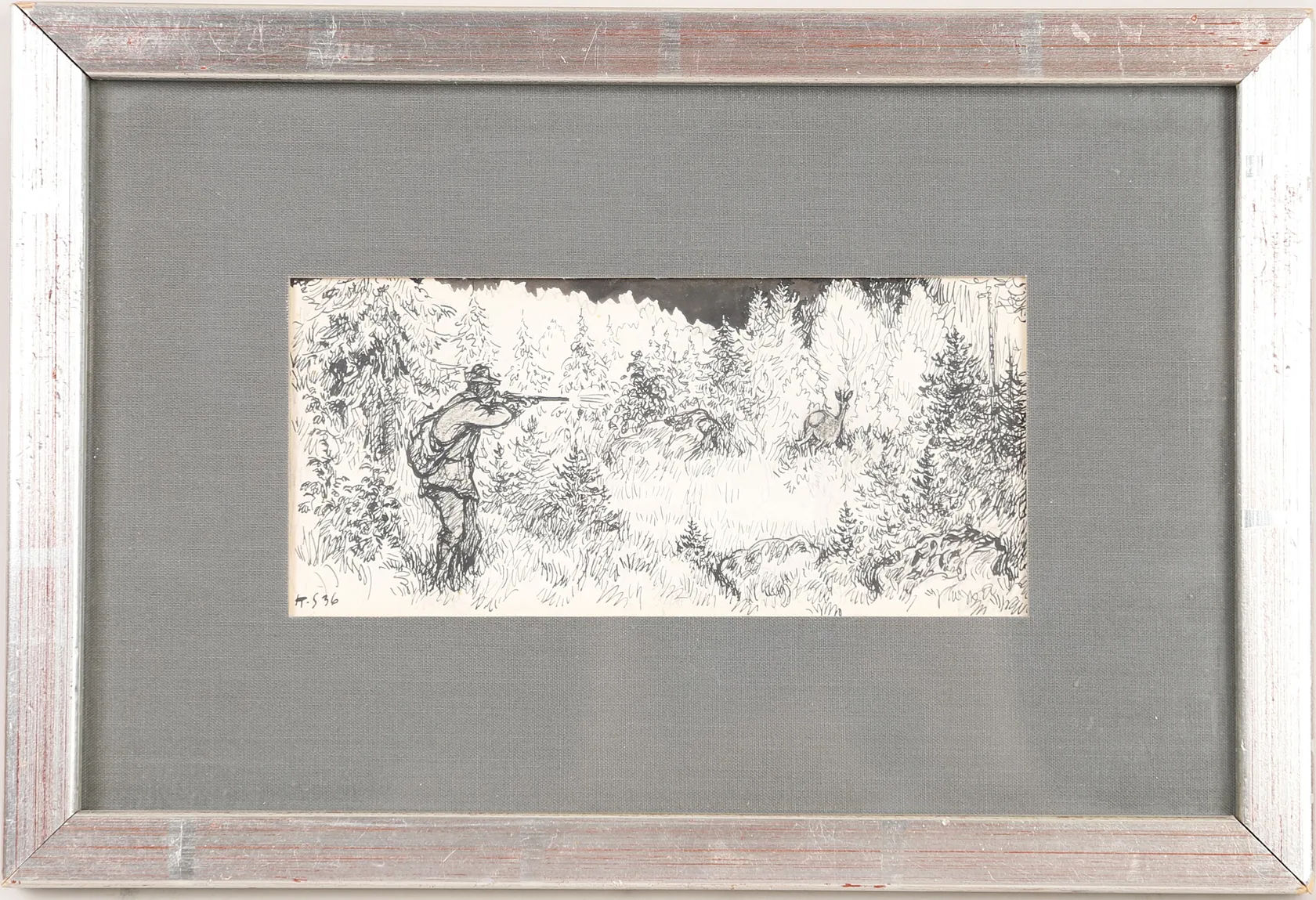 Tavla, Knut Stangenberg, tusch på papper, signerad, daterad 36, bildstorlek 16x7,5cm, rammått 28x19cm, skador på ram, ej examinerad ur ram. Skickas med postpaket. Omfattas av BUS-avgift.