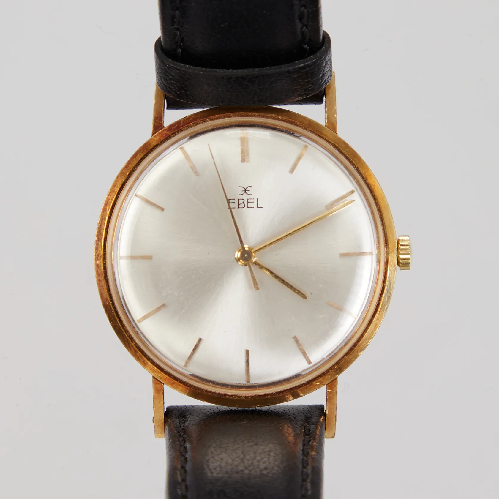 Armbandsur Ebel, 18K, Ø34mm, manuell, läderband med spänne ej original, gravyr, repigt glas, smärre märken på urtavan, box, Bruttovikt: 31,9g.