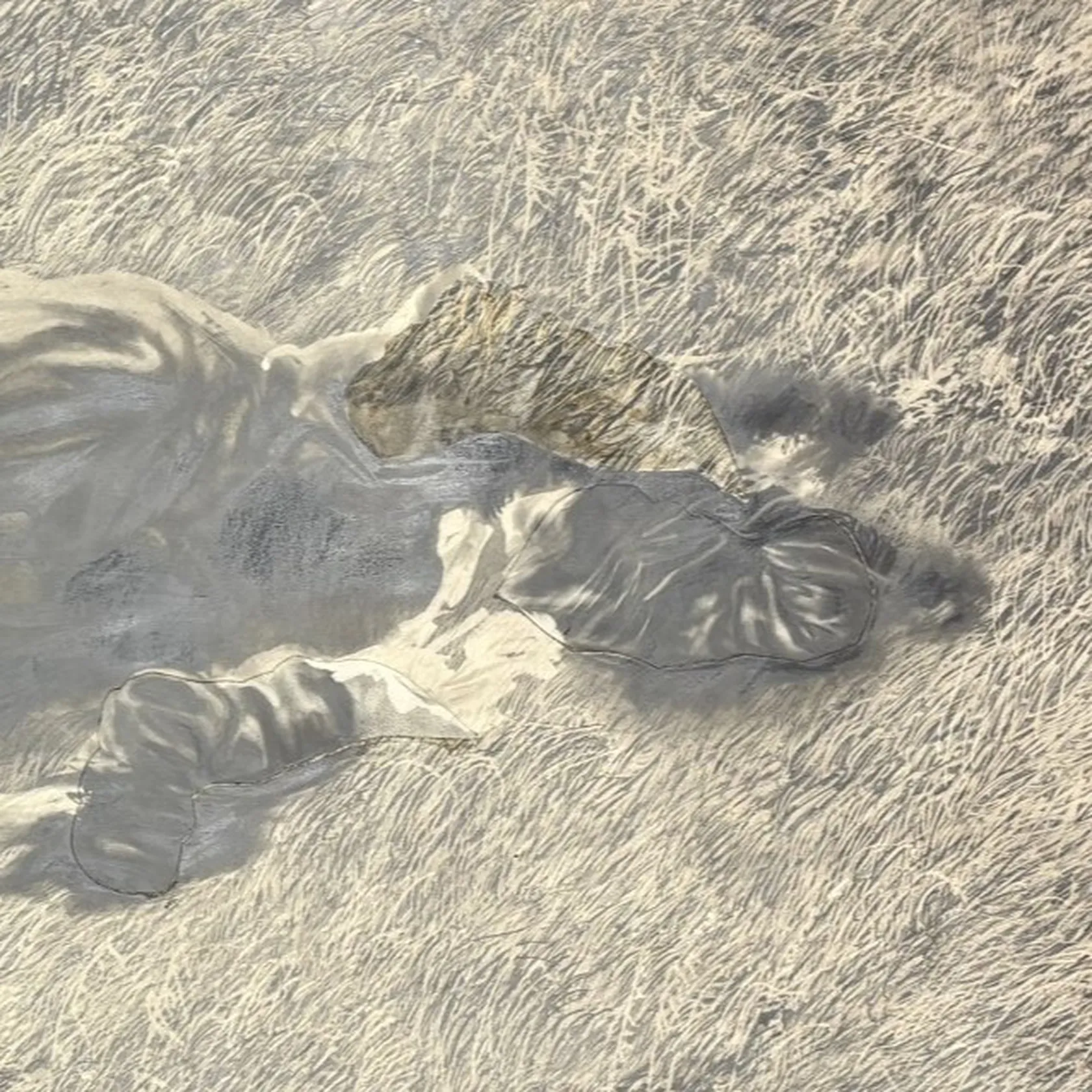 Tavla, Roy Friberg, blyerts och kollage på papper, ca 90x123cm, ej ramad, mindre kantskador, uppfodrad på pappannå, mindre reva. Skickas med postpaket.
