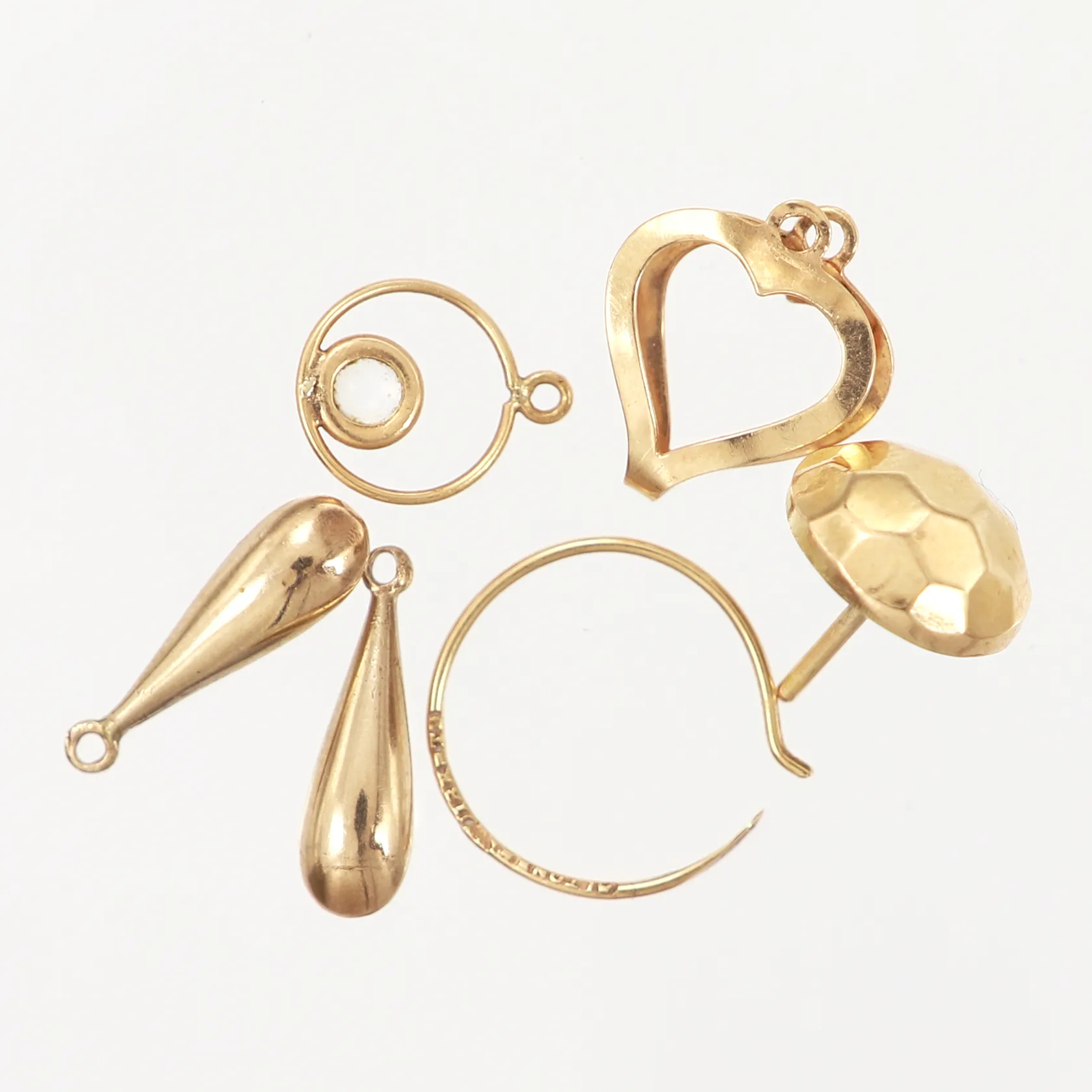Diverse defekt guld, ett par örhängen, två udda örhänge, två hängen ena med sten, 18K Vikt: 3 g.