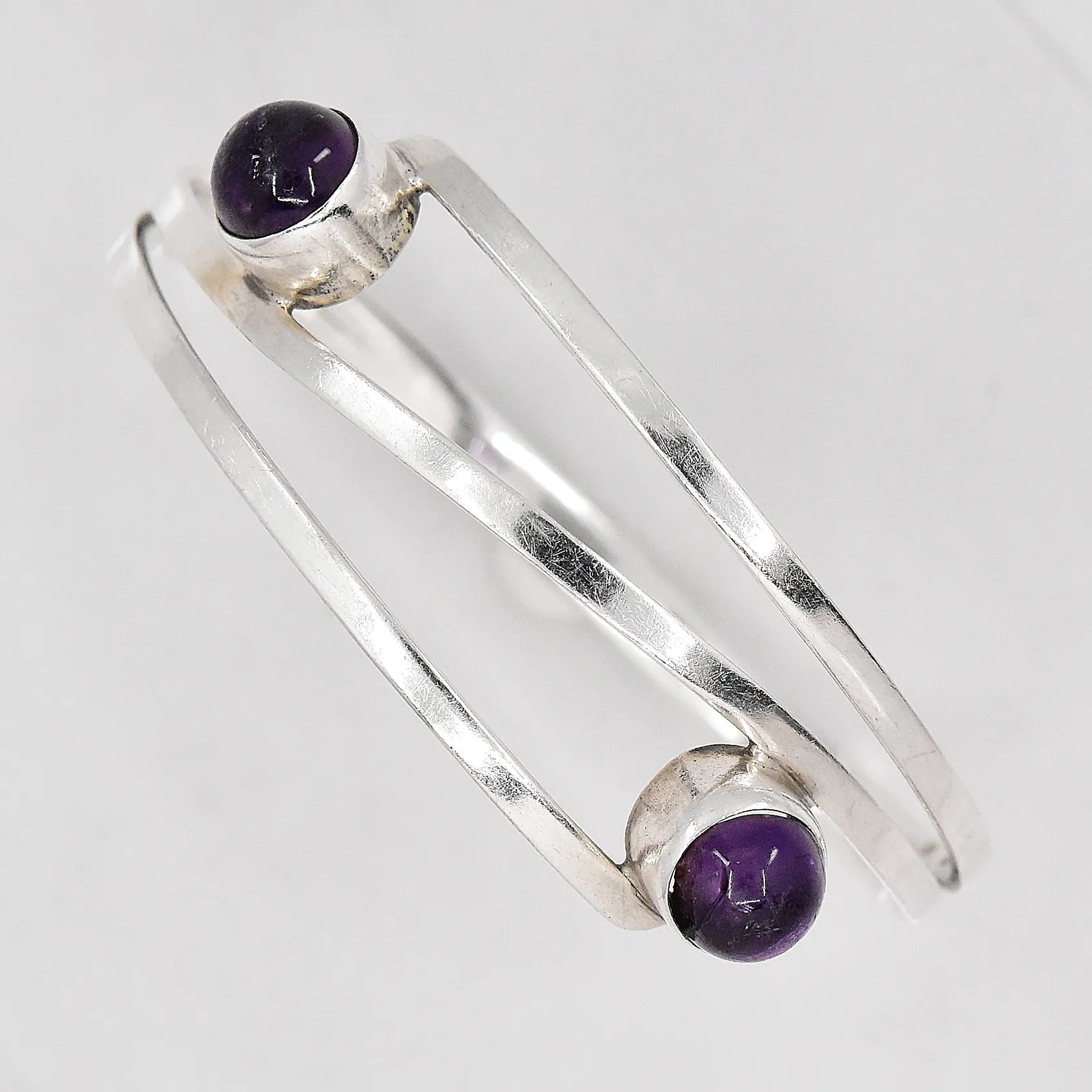 Armring lila stenar handsmide Gussi Ø 67mm, skev skena, nagg på en sten, silver 830/1000 Vikt: 19,5 g.