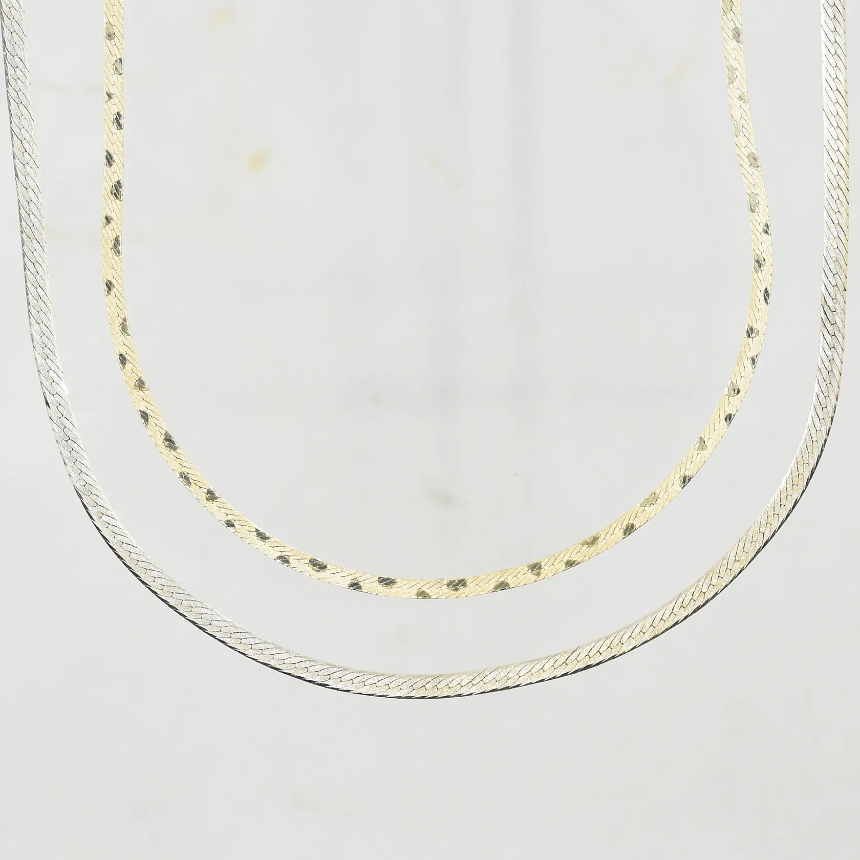 2 collier halvstela modeller, längd:41-41½ cm, bredd 2-3 mm, ojämnheter/mindre klämskador på länkarna, 925/1000 silver. Vikt: 9,1 g.