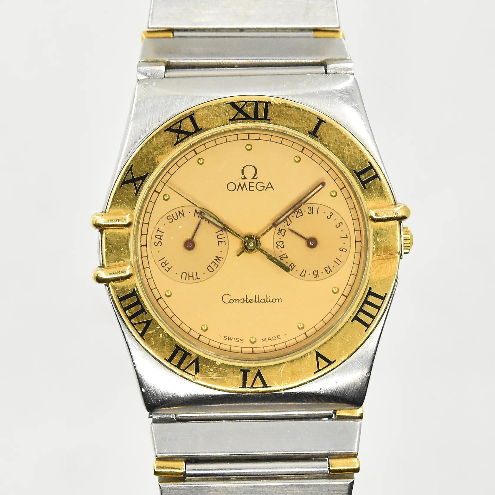 Armbandsur Omega Constellation, boett Ø33 mm, quartz, guld/stål, dag, datum, halvstav, refnr 396.1080, verknr 255472, länkreferens 1448/431, behov av batteribyte, en raider saknas, inga tillbehör.